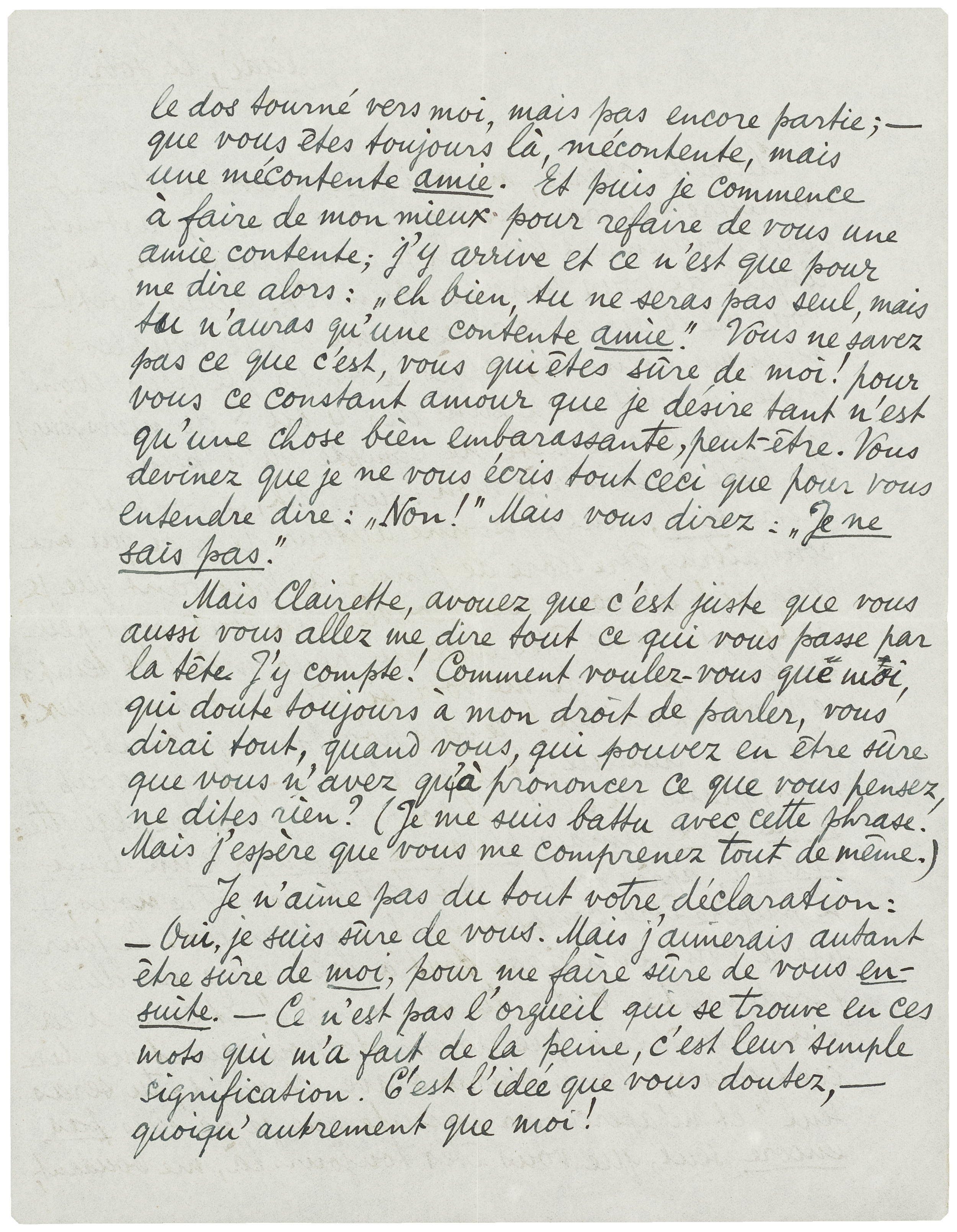 Mais Clairette, avouez que c'est juste que vous aussi vous allez me dire tout ce qui vous passe par la tête. J'y compte! Comment voulez-vous que moi, qui doute toujours à mon droit de parler, vous dirai tout, quand vous, qui pouvez en être sûre que vous n'avez qu'à prononcer ce que vous pensez, ne dites rien? (Je me suis battu avec cette phrase. Mais j'espère que vous me comprenez tout de même.)