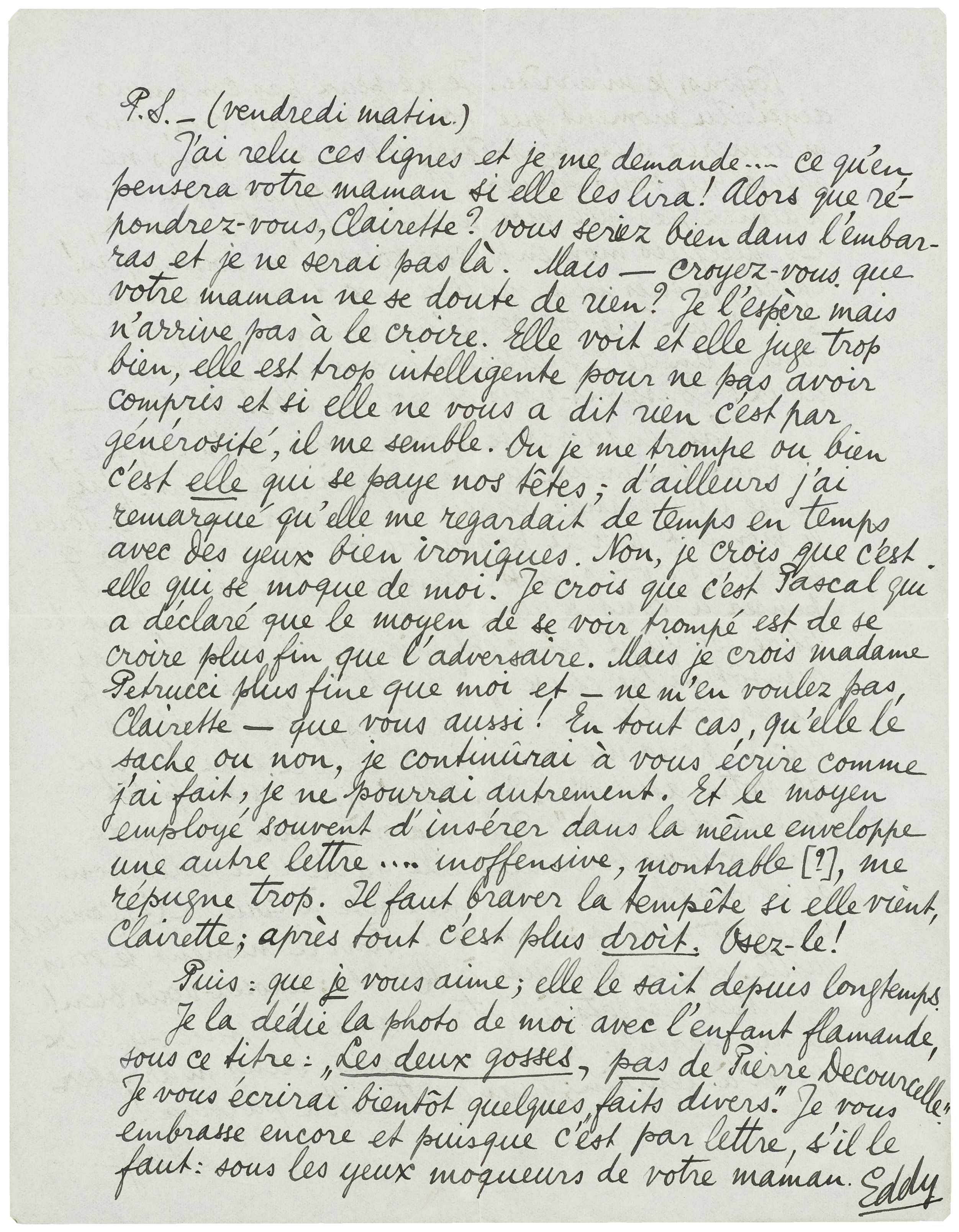J'ai relu ces lignes et je me demande... ce qu'en pensera votre maman si elle les lira! Alors que répondrez-vous, Clairette? vous seriez bien dans l'embarras et je ne serai pas là. Mais - croyez-vous que votre maman ne se doute de rien? Je l'espère mais n'arrive pas à le croire. Elle voit et elle juge trop bien, elle est trop intelligente pour ne pas avoir compris et si elle ne vous a dit rien c'est par générosité, il me semble. Ou je me trompe ou bien c'est elle qui se paye nos têtes; d'ailleurs j'ai remarqué qu'elle me regardait de temps en temps avec des yeux bien ironiques. Non, je crois que c'est elle qui se moque de moi. Je crois que c'est Pascal qui a déclaré que le moyen de se voir trompé est de se croire plus fin que l'adversaire. Mais je crois madame Petrucci plus fine que moi et - ne m'en voulez pas, Clairette - que vous aussi! En tout cas, qu'elle le sache ou non, je continûrai à vous écrire comme j'ai fait, je ne pourrai autrement. Et le moyen employé souvent d'insérer dans la même enveloppe une autre lettre.... inoffensive, montrable (?), me répugne trop. Il faut braver la tempête si elle vient, Clairette; après tout c'est plus droit. Osez-le!