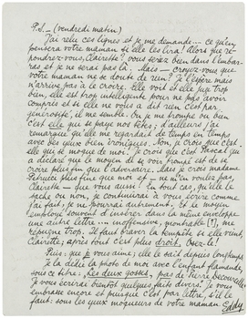 Voyons, je m'arrête. Je ne peux pas continuer ainsi. Au moment que vous lirez tout ceci, vous m'aimerez bien, peut-être. Alors ce discours ne saura que vous fâcher. Car je suppose que vous n'aimez pas que moi je doute de votre amour, les quelques moments que vous n'en doutez pas! Chérie, je suis bien malheureux de mon bonheur. C'est peut-être parce qu'un bonheur complet est comme un de ces gateaux ( vous rappelez-vous?) trop doux! Consolons-nous et croyons ceci! amen. -