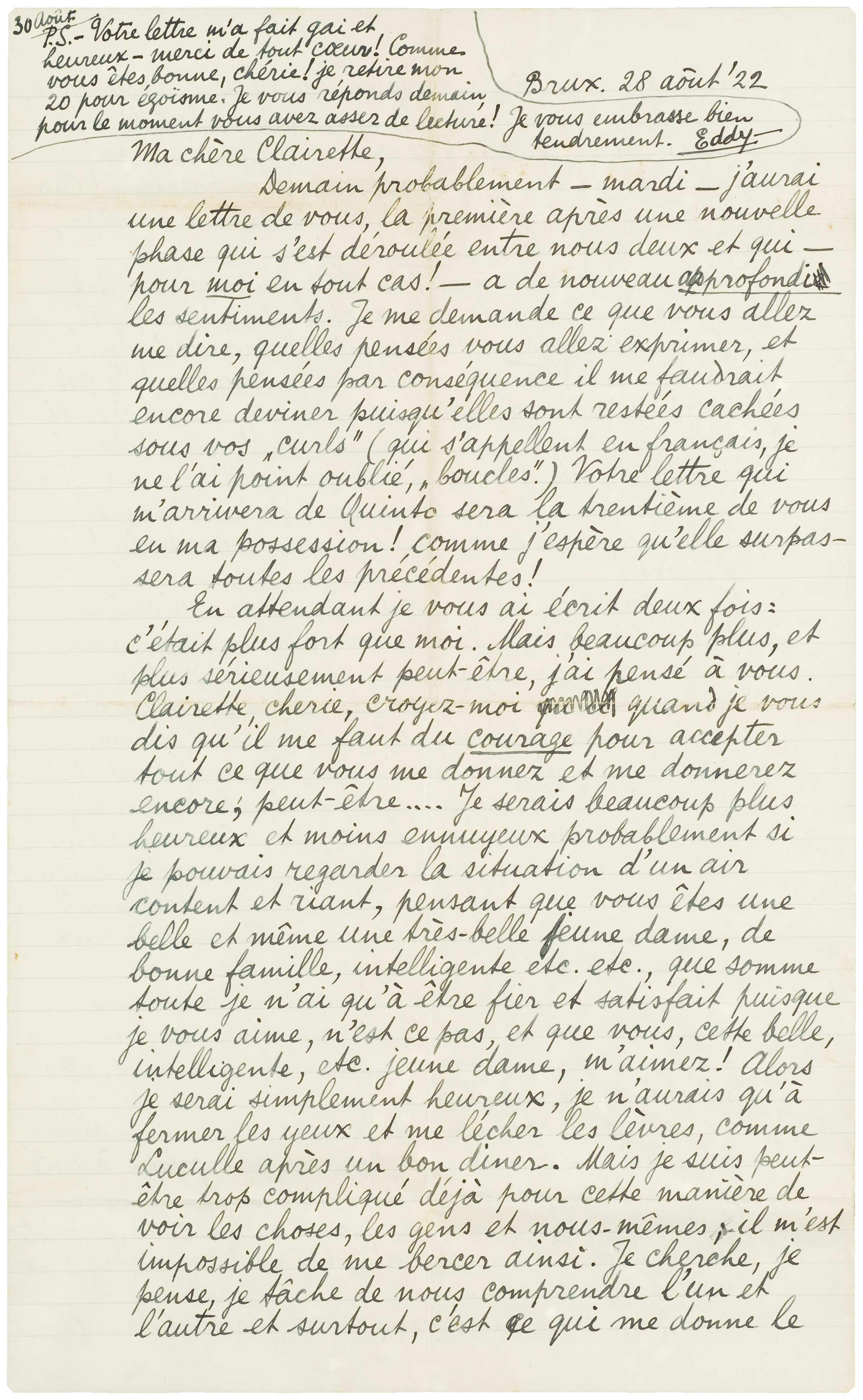 30 Aôut. P.S. -Votre lettre m'a fait gai et heureux. Merci de tout coeur! Comme vous êtes bonne, chérie! je retire mon 20 pour égoïsme. Je vous réponds demain, pour le moment vous avez assez de lecture! Je vous embrasse bien tendrement.