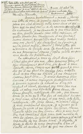 Je dois vous avouer que M. Wolfers m'obsède. Il fait des statues, des dessins, des impressions de guerre, des poésies enfin,- il découvre une nouvelle méthode d'imprimer, etc. il a peut-être d'autres ‘accomplishments’ que j'ignore encore. Et cet homme s'offre, aussi complètement peut-être que moi (c'est vous qui le croyez!) et vous dédaignez tout cela pour vous contenter peut-être de rien. Si vraiment vous ferez cela un jour, votre amour sera bien beau; et bien ferme! Mais le mien? Non, je serai trop honteux, Clairette, si honteux que je n'accepterais plus.