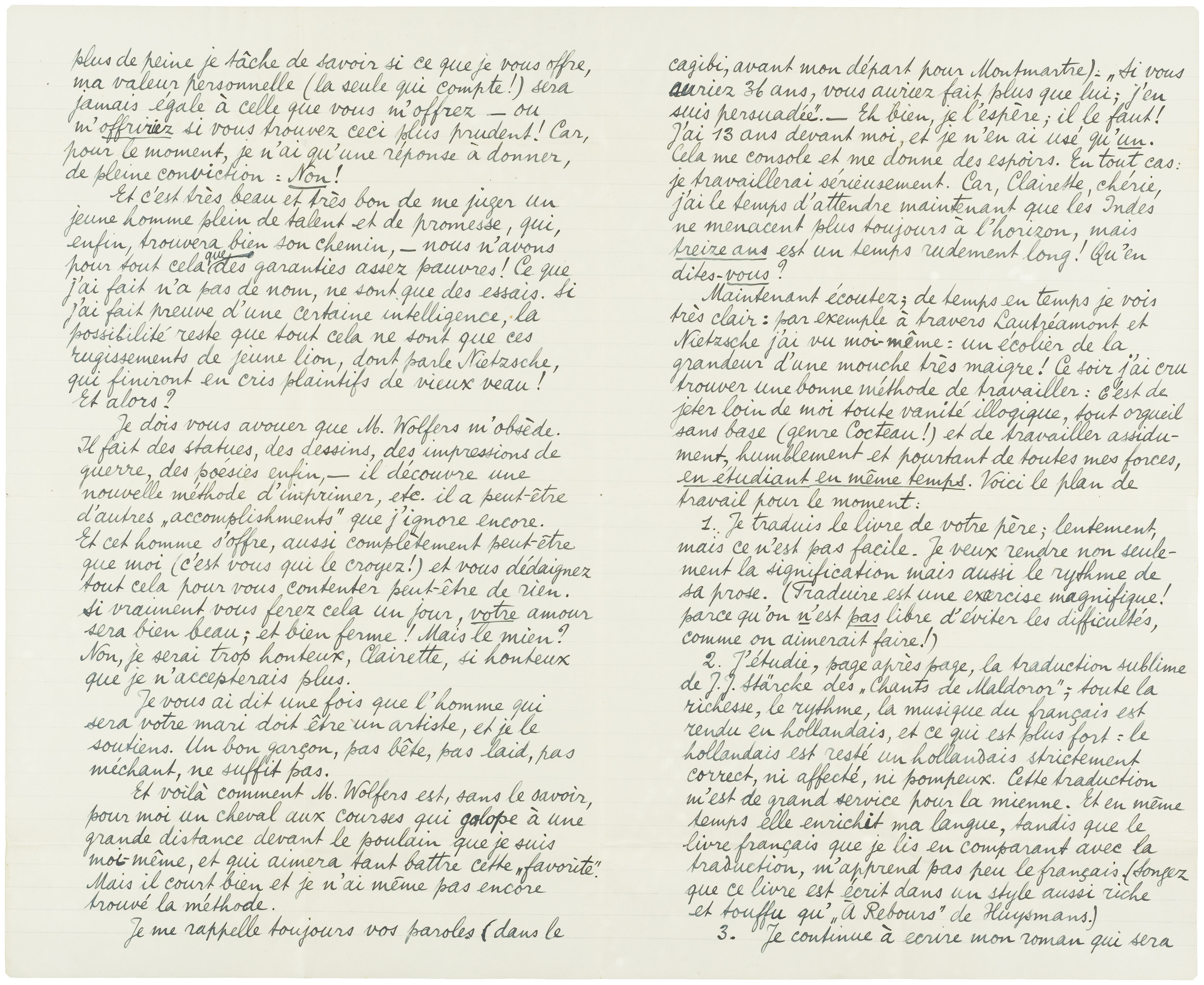 Maintenant écoutez; de temps en temps je vois très clair: par exemple à travers Lautréamont et Nietzsche j'ai vu moi-même: un écolier de la grandeur d'une mouche très maigre! Ce soir j'ai cru trouver une bonne méthode de travailler: c'est de jeter loin de moi toute vanité illogique, tout orgueil sans base (genre Cocteau!) et de travailler assidument, humblement et pourtant de toutes mes forces, en étudiant en même temps. Voici le plan de travail pour le moment: