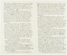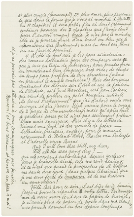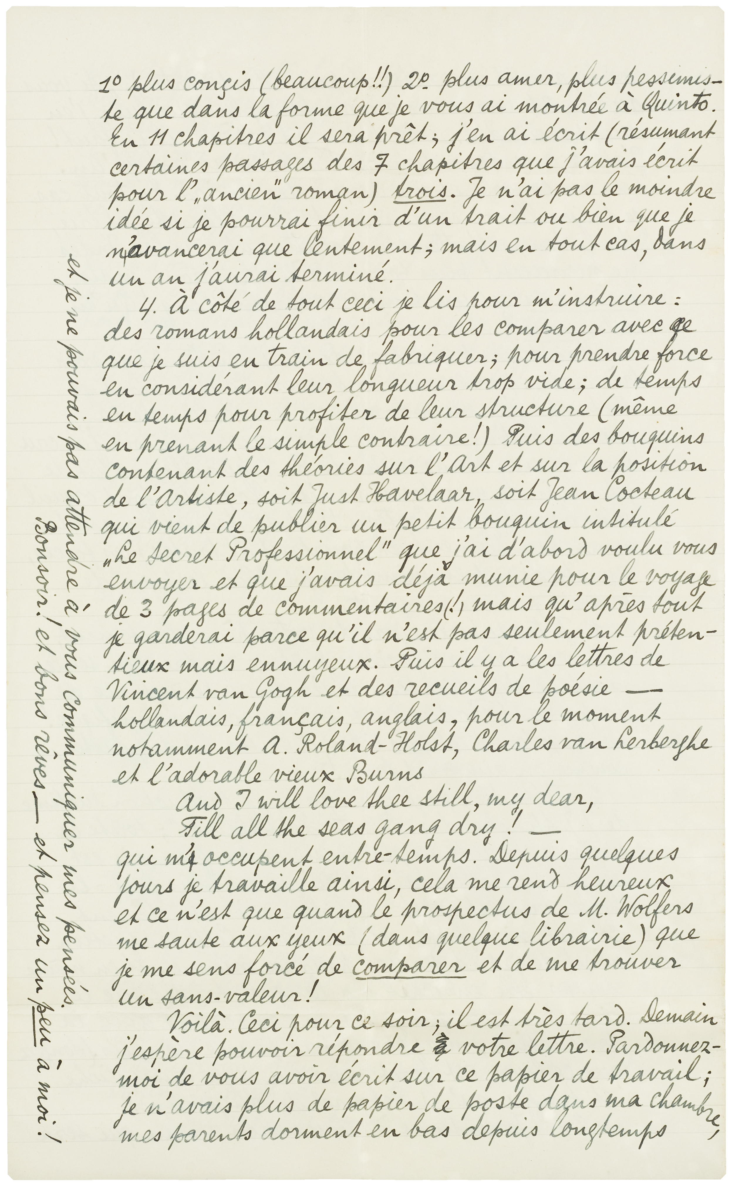 Voilà. Ceci pour ce soir; il est très tard. Demain j'espère pouvoir répondre votre lettre. Pardonnez-moi de vous avoir écrit sur ce papier de travail; je n'avais plus de papier de poste dans ma chambre, mes parents dorment en bas depuis longtemps et je ne pouvais pas attendre à vous communiquer mes pensées.