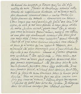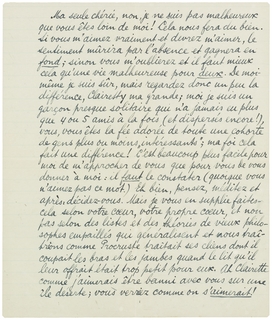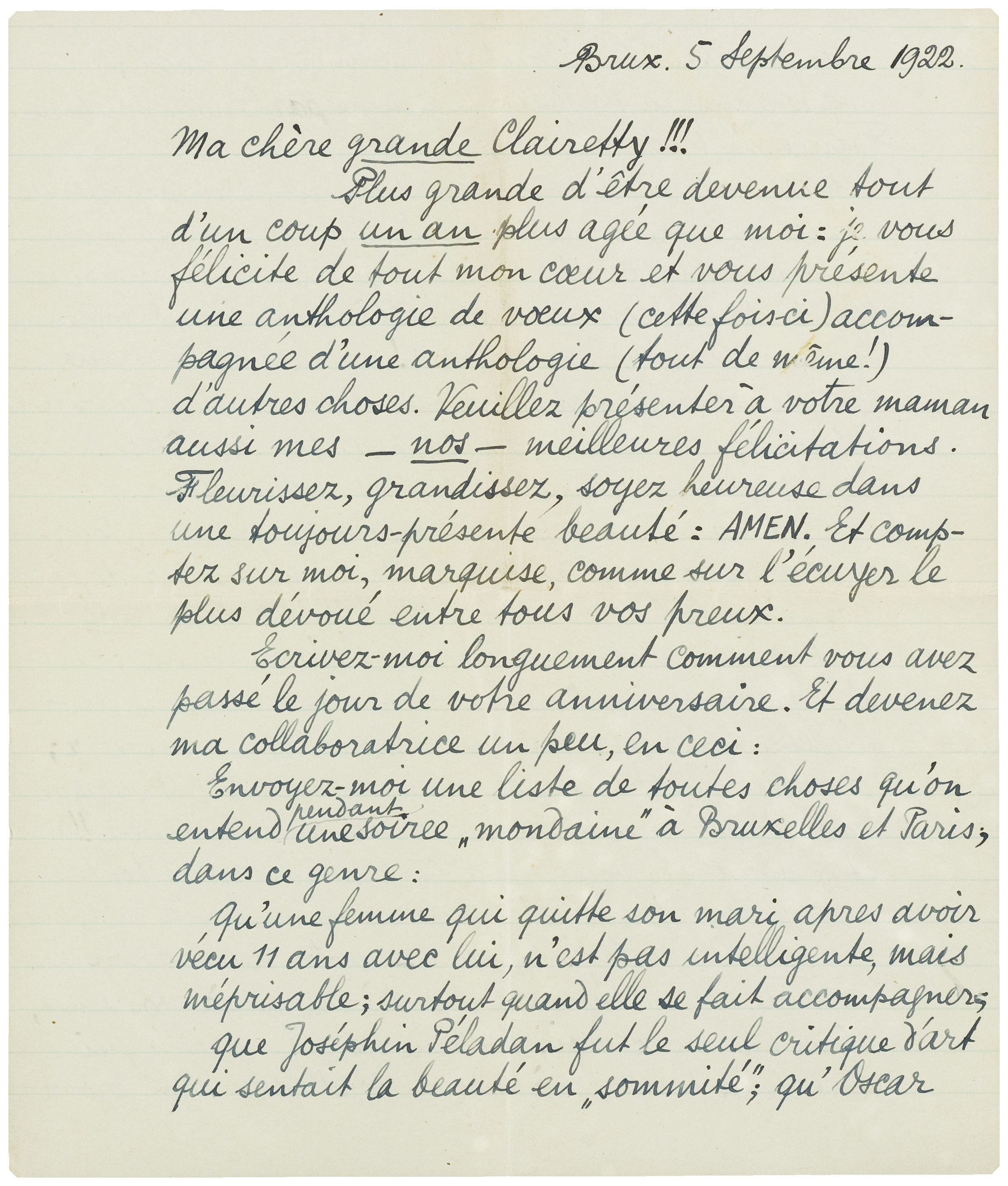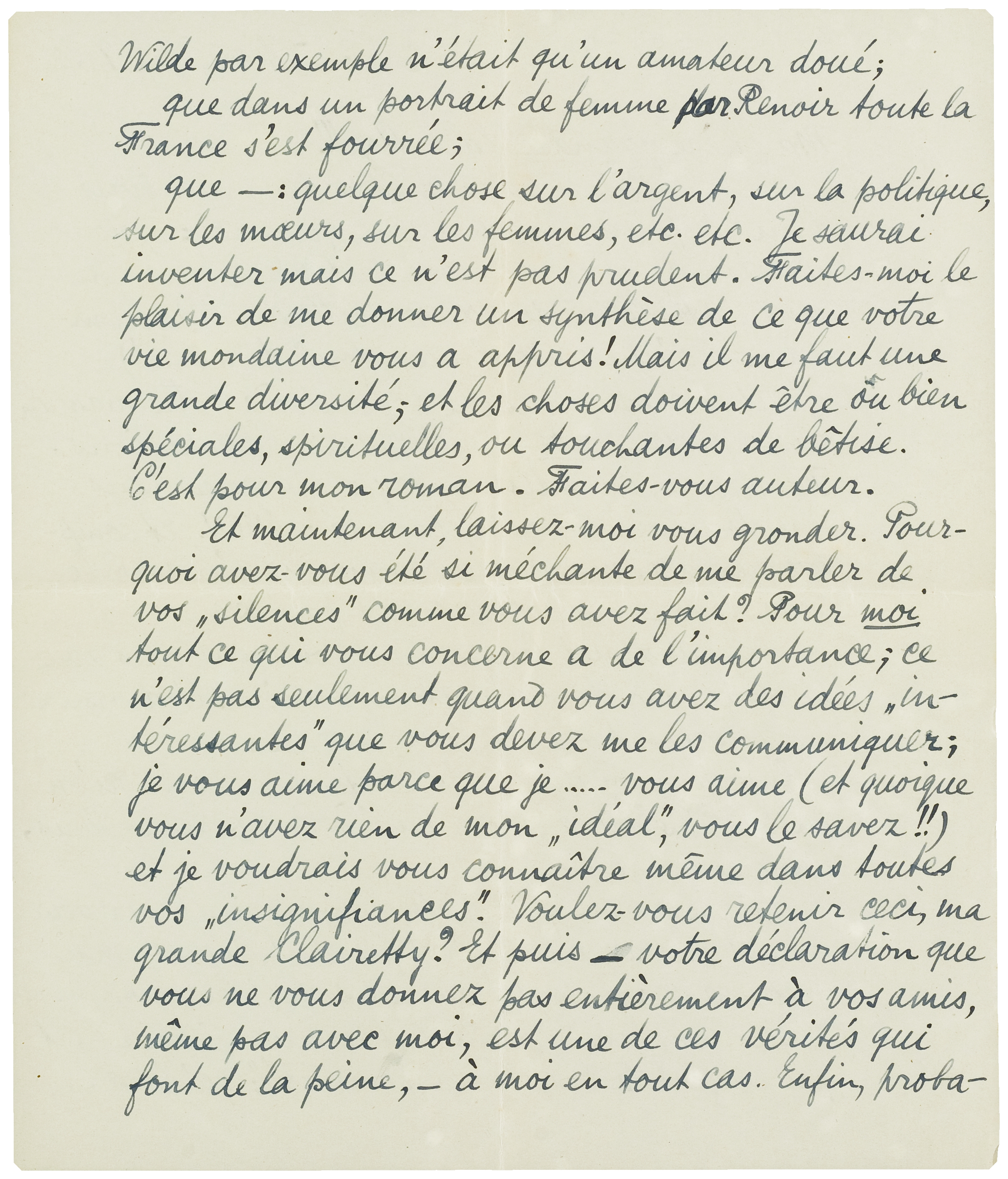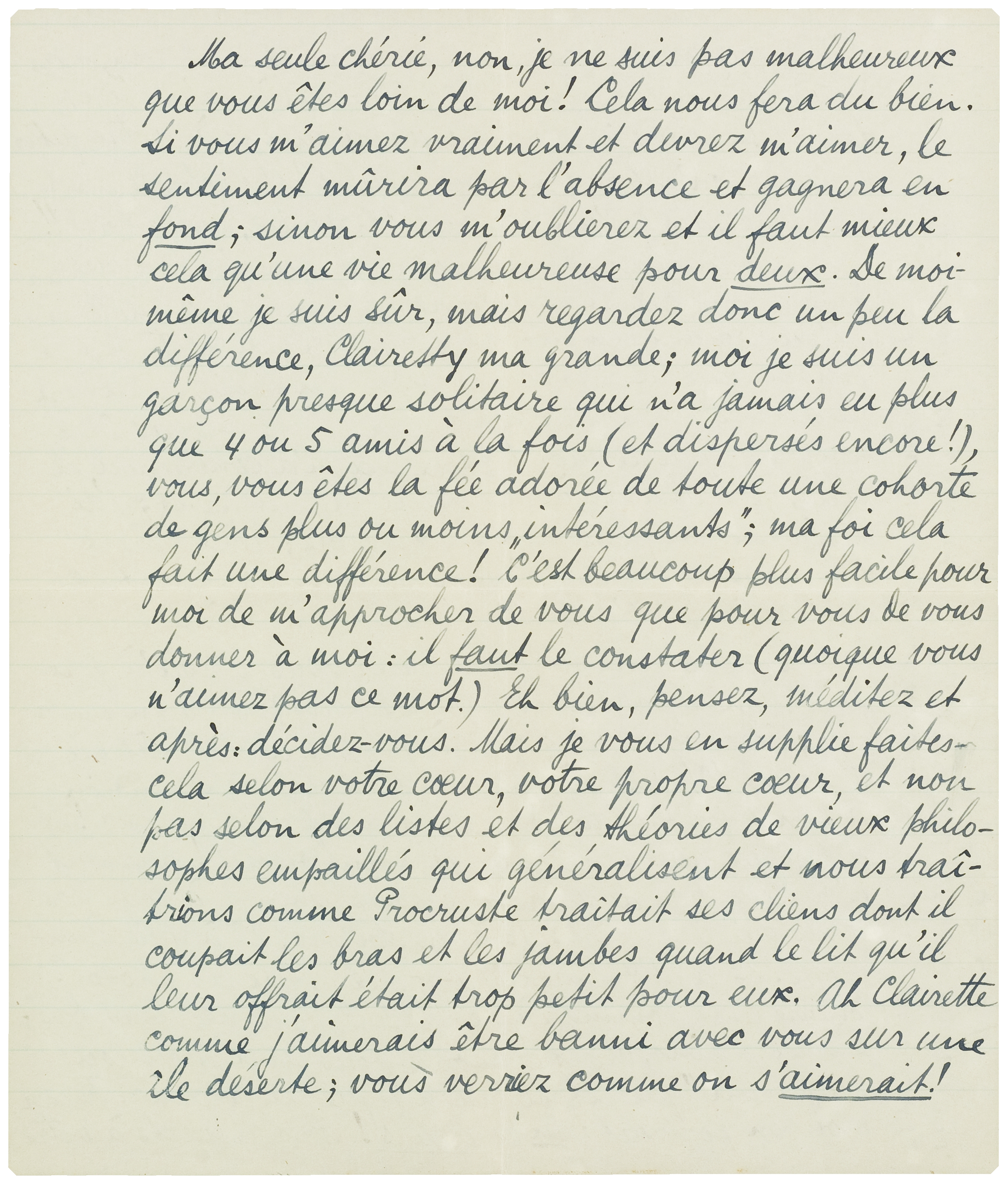 Ma seule chérie, non, je ne suis pas malheureux que vous êtes loin de moi! Cela nous fera du bien. Si vous m'aimez vraiment et devrez m'aimer, le sentiment mûrira par l'absence et gagnera en fond; sinon vous m'oublierez et il faut mieux cela qu'une vie malheureuse pour deux. De moi-même, je suis sûr, mais regardez donc un peu la différence, Clairetty ma grande; moi je suis un garçon presque solitaire qui n'a jamais eu plus que 4 ou 5 amis à la fois (et dispersés encore!), vous, vous êtes la fée adorée de toute une cohorte de gens plus ou moins ‘intéressants’; ma foi cela fait une différence! C'est beaucoup plus facile pour moi de m'approcher de vous que pour vous de vous donner à moi: il faut le constater (quoique vous n'aimez pas ce mot.) Eh bien, pensez, méditez et après: décidez-vous. Mais je vous en supplie faites-cela selon votre coeur, votre propre coeur, et non pas selon des listes et des théories de vieux philosophes empaillés qui généralisent et nous traîtrions comme Procruste traîtait ses cliens dont il coupait les bras et les jambes quand le lit qu'il leur offrait était trop petit pour eux. Ah Clairette comme j'aimerais être banni avec vous sur une île déserte; vous verriez comme on s'aimerait!