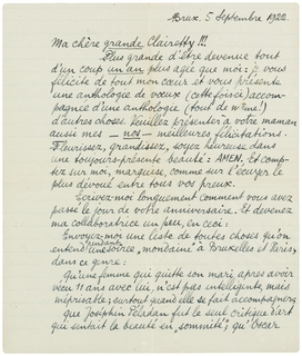 Je garde une surprise pour vous jusqu'à peu près mon départ. Mes parents vous font bien remercier; êtes-vous rassurée à propos de ce château d'Assche!?! Dites à Giulio qu'il donne exécution à son projet de m'écrire, ça me ferait plaisir! et dites-lui que je ne leur ai point oublié! Surtout n'oubliez pas de faire mes compliments à tous vos amis qui arrivent: 10 à M. Wolfers; 20 à Mlle. Lambiotte. 30 à Mlle Simone (a-t-elle reçue les photos?) Comme c'est dommage que Mme Godard ne vient pas; je vous plains, mais consolez-vous avec ‘glouglou loulouglou’ qui est si magnifique de couleur. Faites-moi son portrait: en couleurs! Mes respects à votre maman que je souhaite une victoire écrasante sur les mouches et mes plus chauds baisers pour vous.
