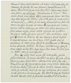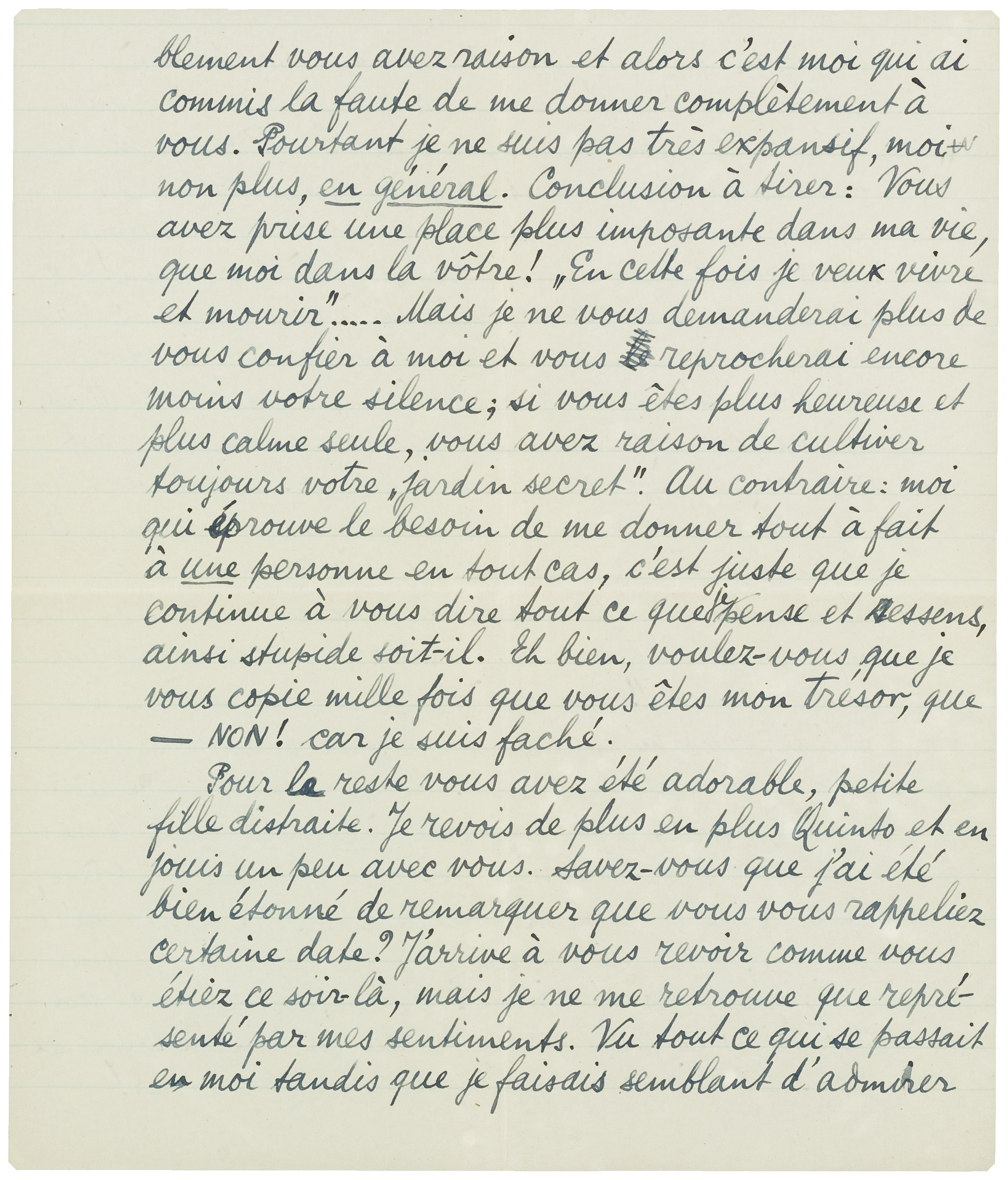 Et maintenant, laissez-moi vous gronder. Pourquoi avez-vous été si méchante de me parler de vos ‘silences’ comme vous avez fait? Pour moi tout ce qui vous concerne a de l'importance; ce n'est pas seulement quand vous avez des idées ‘intéressantes’ que vous devez me les communiquer; je vous aime parce que je..... vous aime (et quoique vous n'avez rien de mon ‘idéal’, vous le savez!!) et je voudrais vous connaître même dans toutes vos ‘insignifiances’. Voulez-vous retenir ceci, ma grande Clairetty? Et puis - votre déclaration que vous ne vous donnez pas entièrement à vos amis, même pas avec moi, est une de ces vérités qui font de la peine, - à moi en tout cas. Enfin, probablement vous avez raison et alors c'est moi qui ai commis la faute de me donner complètement à vous. Pourtant je ne suis pas très expansif, moi non plus, en général. Conclusion à tirer: Vous avez prise une place plus imposante dans ma vie, que moi dans la vôtre! ‘En cette fois je veux vivre et mourir’..... Mais je ne vous demanderai plus de vous confier à moi et vous reprocherai encore moins votre silence; si vous êtes plus heureuse et plus calme seule, vous avez raison de cultiver toujours votre ‘jardin secret’. Au contraire: moi qui éprouve le besoin de me donner tout à fait à une personne en tout cas, c'est juste que je continue à vous dire tout ce que je pense et ressens, ainsi stupide soit-il. Eh bien, voulez-vous que je vous copie mille fois que vous êtes mon trésor, que - NON! car je suis faché.