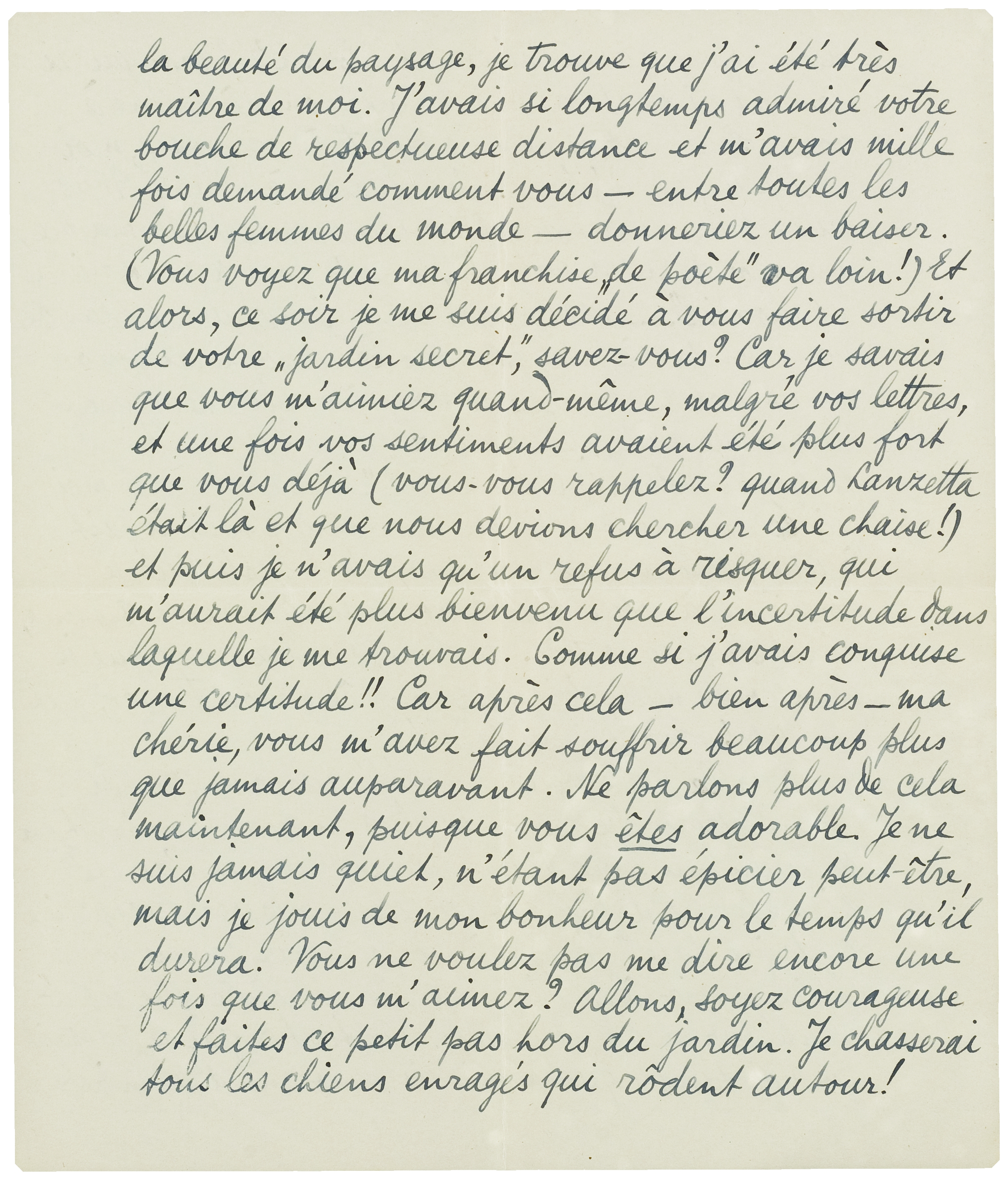 Pour le reste vous avez été adorable, petite fille distraite. Je revois de plus en plus Quinto et en jouis un peu avec vous. Savez-vous que j'ai été bien étonné de remarquer que vous vous rappeliez certaine date? J'arrive à vous revoir comme vous étiez ce soir-là, mais je ne me retrouve que représenté par mes sentiments. Vu tout ce qui se passait en moi tandis que je faisais semblant d'admirer la beauté du paysage, je trouve que j'ai été très maître de moi. J'avais si longtemps admiré votre bouche de respectueuse distance et m'avais mille fois demandé comment vous - entre toutes les belles femmes du monde - donneriez un baiser. (Vous voyez que ma franchise ‘de poète’ va loin!) Et alors, ce soir je me suis décidé à vous faire sortir de votre ‘jardin secret’, savez-vous? Car je savais que vous m'aimiez quand-même, malgré vos lettres, et une fois vos sentiments avaient été plus fort que vous déjà (vous-vous rappelez? quand Lanzetta était là et que nous devions chercher une chaise!) et puis je n'avais qu'un refus à risquer, qui m'aurait été plus bienvenu que l'incertitude dans laquelle je me trouvais. Comme si j'avais conquise une certitude!! Car après cela - bien après - ma chérie, vous m'avez fait souffrir beaucoup plus que jamais auparavant. Ne parlons plus de cela maintenant, puisque vous êtes adorable. Je ne suis jamais quiet, n'étant pas épicier peut-être, mais je jouis de mon bonheur pour le temps qu'il durera. Vous ne voulez pas me dire encore une fois que vous m'aimez? Allons, soyez courageuse et faites ce petit pas hors du jardin. Je chasserai tous les chiens enragés qui rôdent autour!