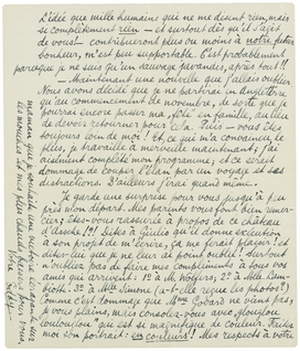 - Maintenant une nouvelle que j'allais oublier. Nous avons décidé que je ne partirai en Angleterre qu'au commencement de novembre, de sorte que je pourrai encore passer ma ‘fête’ en famille, au lieu de devoir retourner pour cela. Puis - vous êtes toujours loin de moi! Et, ce qui m'a convaincu le plus, je travaille à merveille maintenant; j'ai aisément complété mon programme; et ce serait dommage de couper l'élan par un voyage et ses distractions. D'ailleurs j'irai quand même.