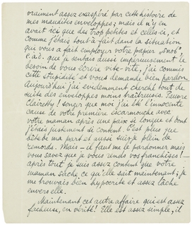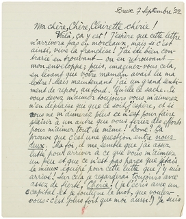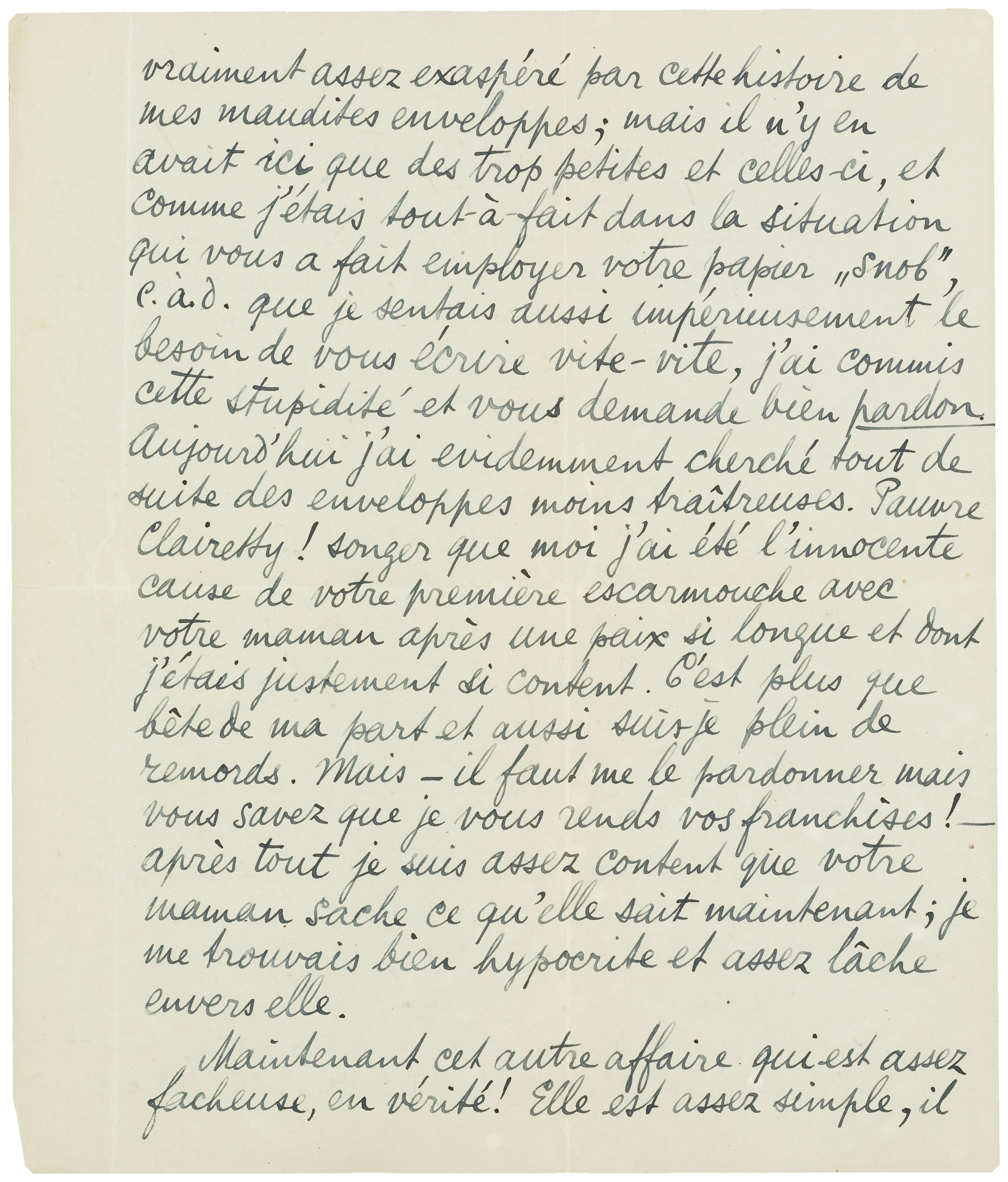 Voilà, ça y est! J'espère que cette lettre n'arrivera pas en morceaux, mais si c'est ainsi, vive la franchise! J'ai été bien contrarié en trouvant - ou en retrouvant - mon enveloppe; puis, imaginez-vous cela, en lisant que votre maman avait lu ma lettre! Mais maintenant j'ai un grand sentiment de repos, au fond. Qu'elle le sache. Si vous devez m'aimer toujours vous m'aimerez n'en déplaise qui que ce soit, j'espère, et si vous ne m'aimerez plus ce n'est pour faire plaisir à un autre que vous feriez des efforts pour m'aimer tout de même! Donc? Ça prouve que c'est une question entre nous deux; Ma foi, il me semble que j'ai assez lutté pour arriver à ce que vous m'aimiez un peu et que ce n'est pas parce que j'étais le mieux équipé pour cette lutte que j'y suis arrivé! Sur cela je regarderai toujours avec assez de fierté, Cherie! (je l'écris avec un c capital et je souligne le mot, que voulez-vous: c'est plus fort que moi aussi!) Je suis vraiment assez exaspéré par cette histoire de mes maudites enveloppes; mais il n'y en avait ici que des trop petites et celles-ci, et comme j'étais tout-à-fait dans la situation qui vous a fait employer votre papier ‘snob’, c.à.d. que je sentais aussi impérieusement le besoin de vous écrire vite-vite, j'ai commis cette stupidité et vous demande bien pardon. Aujourd'hui j'ai evidemment cherché tout de suite des enveloppes moins traîtreuses. Pauvre Clairetty! Songer que moi j'ai été l'innocente cause de votre première escarmouche avec votre maman après une paix si longue et dont j'étais justement si content. C'est plus que bête de ma part et aussi suis-je plein de remords. Mais - il faut me le pardonner mais vous savez que je vous rends vos franchises! - après tout je suis assez content que votre maman sache ce qu'elle sait maintenant; je me trouvais bien hypocrite et assez lâche envers elle.