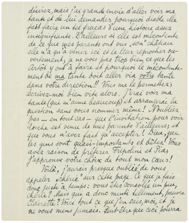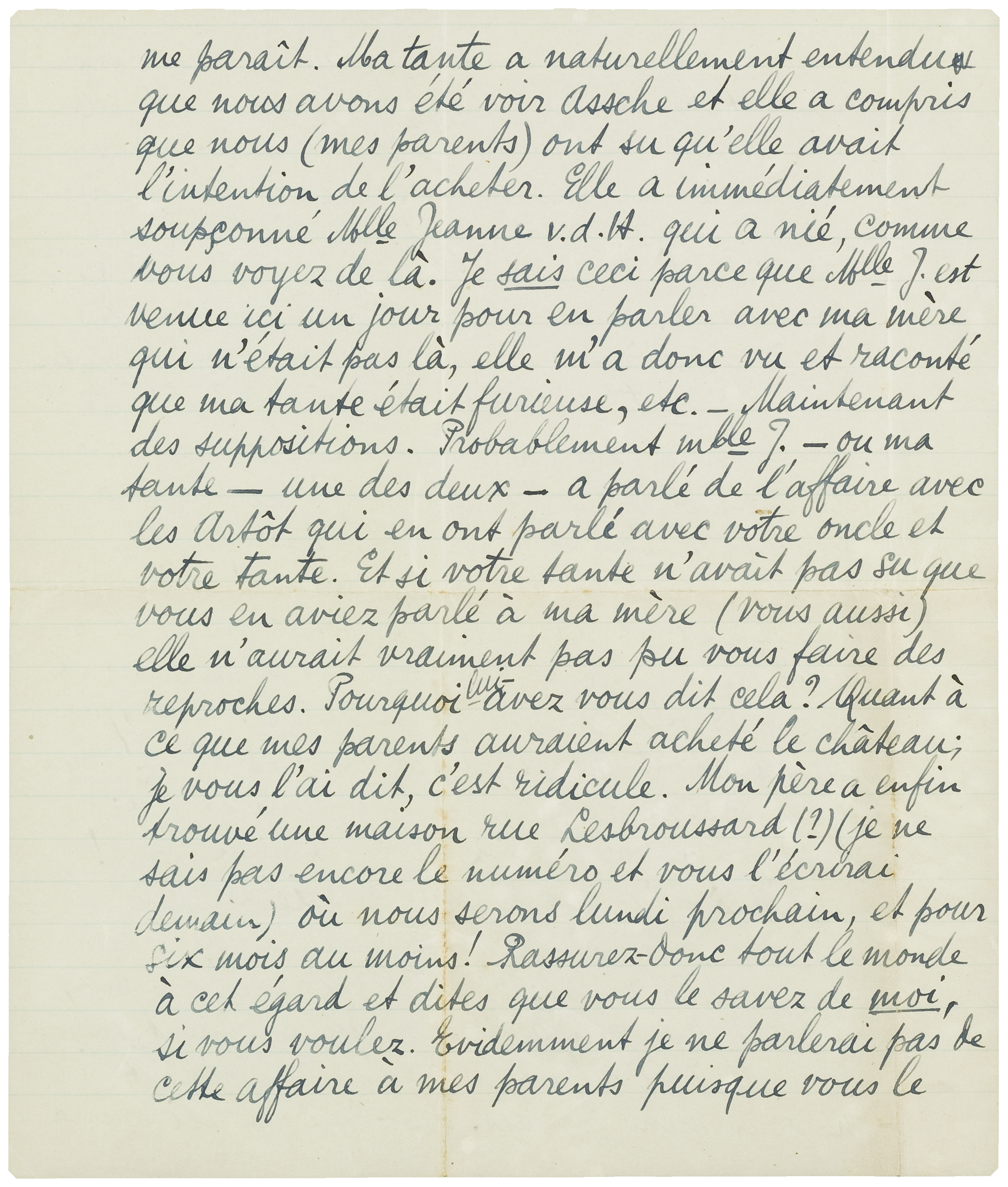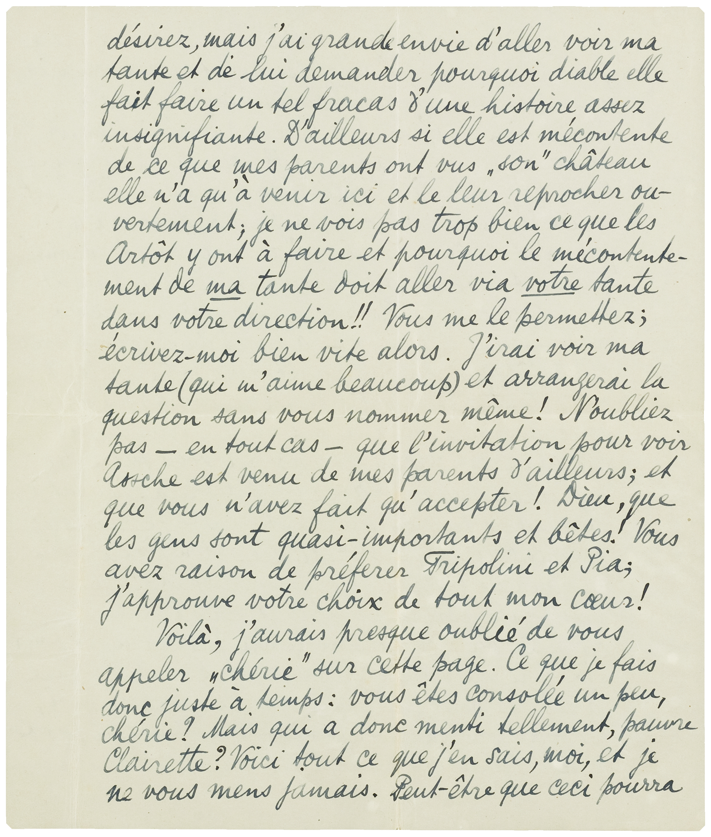Voilà, j'aurais presque oublié de vous appeler ‘chérie’ sur cette page. Ce que je fais donc juste à temps: vous êtes consolée un peu, chérie? Mais qui a donc menti tellement, pauvre Clairette? Voici tout ce que j'en sais, moi, et je ne vous mens jamais. Peut-être que ceci pourra vous aider à comprendre. Ah, attendez, - j'allais oublier que Mlle J. avait trouvé que mes parents devraient dire qu'ils avaient lu un avertissement dans le Soir si ma tante viendrait leur demander pourquoi ils y sont allés; mais ma tante ne vous a jamais dit un mot. Aussi il ne s'agit nullement du fait que mes parents auront achetés A. mais qu'ils ont vus. C'est de vous que j'entends pour la première fois qu'on nous soupçonne de l'avoir acheté; mais je sais très très sûrement que ce n'est pas vrai. Mon père ne voudrait jamais s'isoler tellement; et ma mère parle toujours de retourner aux Indes. Ne croyez donc pas qu'ils m'ont laissé ignorer leurs intentions. Il n'y a jamais eu question entre eux d'acheter ce château. C'est une promenade en auto assez simple qui a des suites compliquées!
