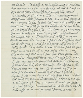 Maintenant cet autre affaire qui est assez facheuse, en vérité! Elle est assez simple, il me paraît. Ma tante a naturellement entendu que nous avons été voir Assche et elle a compris que nous (mes parents) ont su qu'elle avait l'intention de l'acheter. Elle a immédiatement soupçonné Mlle Jeanne v.d.H. qui a nié, comme vous voyez de là. Je sais ceci parce que Mlle J. est venue ici un jour pour en parler avec ma mère qui n'était pas là, elle m'a donc vu et raconté que ma tante était furieuse, etc. - Maintenant des suppositions. Probablement Mlle J. - ou ma tante - une des deux - a parlé de l'affaire avec les Artôt qui en ont parlé avec votre oncle et votre tante. Et si votre tante n'avait pas su que vous en aviez parlé à ma mère (vous aussi) elle n'aurait vraiment pas pu vous faire des reproches. Pourquoi lui-avez vous dit cela? Quant à ce que mes parents auraient acheté le château; je vous l'ai dit, c'est ridicule. Mon père a enfin trouvé une maison rue Lesbroussard (?) (je ne sais pas encore le numéro et vous l'écrirai demain) où nous serons lundi prochain, et pour six mois au moins! Rassurez-donc tout le monde à cet égard et dites que vous le savez de moi, si vous voulez. Evidemment je ne parlerai pas de cette affaire à mes parents puisque vous le désirez, mais j'ai grande envie d'aller voir ma tante et de lui demander pourquoi diable elle fait faire un tel fracas d'une histoire assez insignifiante. D'ailleurs si elle est mécontente de ce que mes parents ont vus ‘son’ château elle n'a qu'à venir ici et le leur reprocher ouvertement; je ne vois pas trop bien ce que les Artôt y ont à faire et pourquoi le mécontentement de ma tante doit aller via votre tante dans votre direction!! Vous me le permettez; écrivez-moi bien vite alors. J'irai voir ma tante (qui m'aime beaucoup) et arrangerai la question sans vous nommer même! N'oubliez pas - en tout cas - que l'invitation pour voir Assche est venu de mes parents d'ailleurs; et que vous n'avez fait qu'accepter! Dieu, que les gens sont quasi-importants et bêtes! Vous avez raison de préferer Tripolini et Pia; j'approuve votre choix de tout mon coeur!