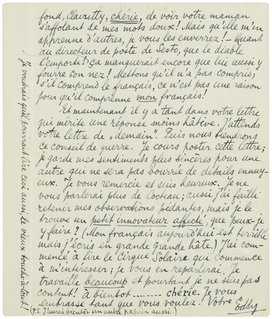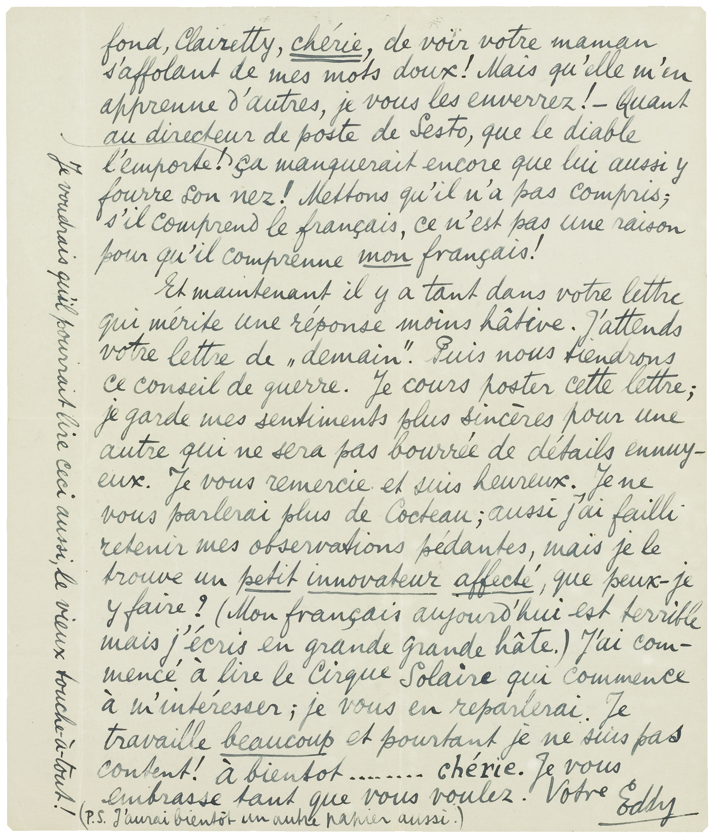 Et maintenant il y a tant dans votre lettre qui mérite une réponse moins hâtive. J'attends votre lettre de ‘demain’. Puis nous tiendrons ce conseil de guerre. Je cours poster cette lettre; je garde mes sentiments plus sincères pour une autre qui ne sera pas bourrée de détails ennuyeux. Je vous remercie et suis heureux. Je ne vous parlerai plus de Cocteau; aussi j'ai failli retenir mes observations pédantes, mais je le trouve un petit innovateur affecté, que peux-je y faire? (Mon français aujourd'hui est terrible mais j'écris en grande grande hâte.) J'ai commencé à lire Le Cirque Solaire qui commence à m'intéresser; je vous en reparlerai. Je travaille beaucoup et pourtant je ne suis pas content! A bientot........ chérie. Je vous embrasse tant que vous voulez.