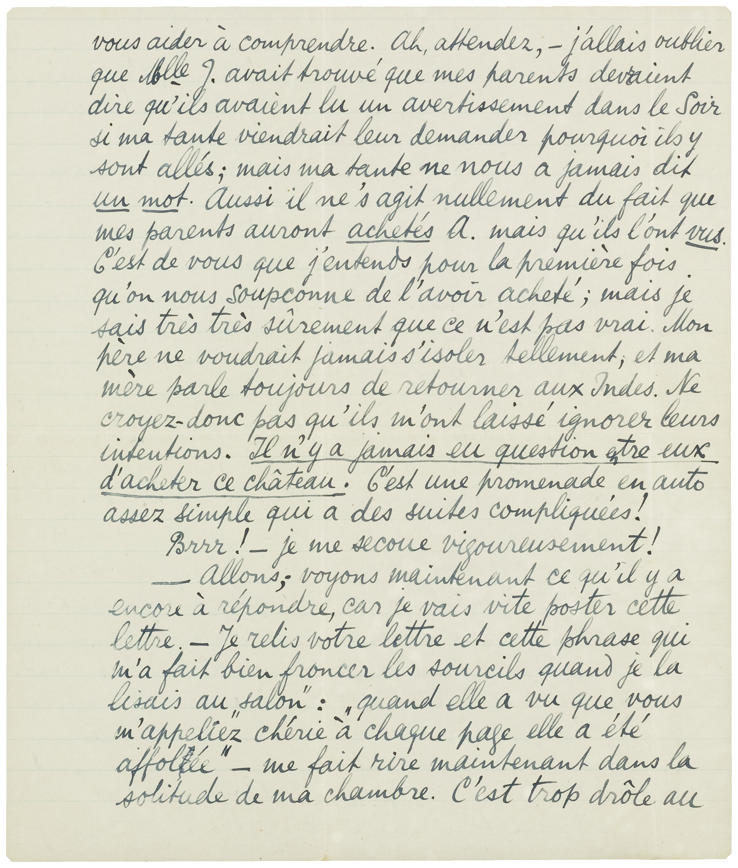 (Mais si vous voulez, j'arrangerai cette histoire ici avec ma tante. J'ai horreur des complications dans des affaires de peu d'importance. Je ferai promettre ma tante de ne pas gronder la pauvre Mlle J. - et je lui raconterai (en secret aussi, puisque c'est la mode!!) l'indiscrétion de celle-ci. Ensuite je la rassurerai à l'égard de l'achat. Et tout sera pour le mieux dans le - etc. Vous consentez? J'ai envie de le faire sans votre autorisation; car c'est idiot qu'on vous reproche les indiscrétions d'une autre; et ensuite..... un fait qui n'a jamais eu lieu (l'achat du château par mes parents!)