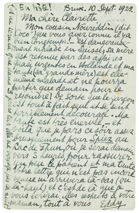 Mon cousin Noureddin (dit ‘Coco’) que vous avez connu il y a bien longtemps! - est dangereusement malade en Suisse; sa mère est retenue par des affaires quasi urgentes en Hollande et ma tante (sa grande-mère) est elle-même malade et ne pourra partir que demain pour le rejoindre et ne sera là que dans 3 jours car elle ne voyage pas la nuit! De sorte que le garçon est tout à fait seul et se sent terriblement découragé. Ma tante est très énervée, - et voilà que je pars ce soir assez brusquement pour Spiez au Lac de Thun, où je serai demain vers 3 heures, pour rassurer un peu le patient et ma tante. Votre lettre qui n'est pas encore venue m'arrivera là-bas (ou là-haut) et c'est de là que je vous écrirai. Mes respects à votre maman, tout à vous
