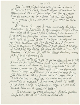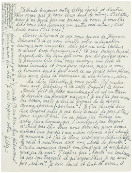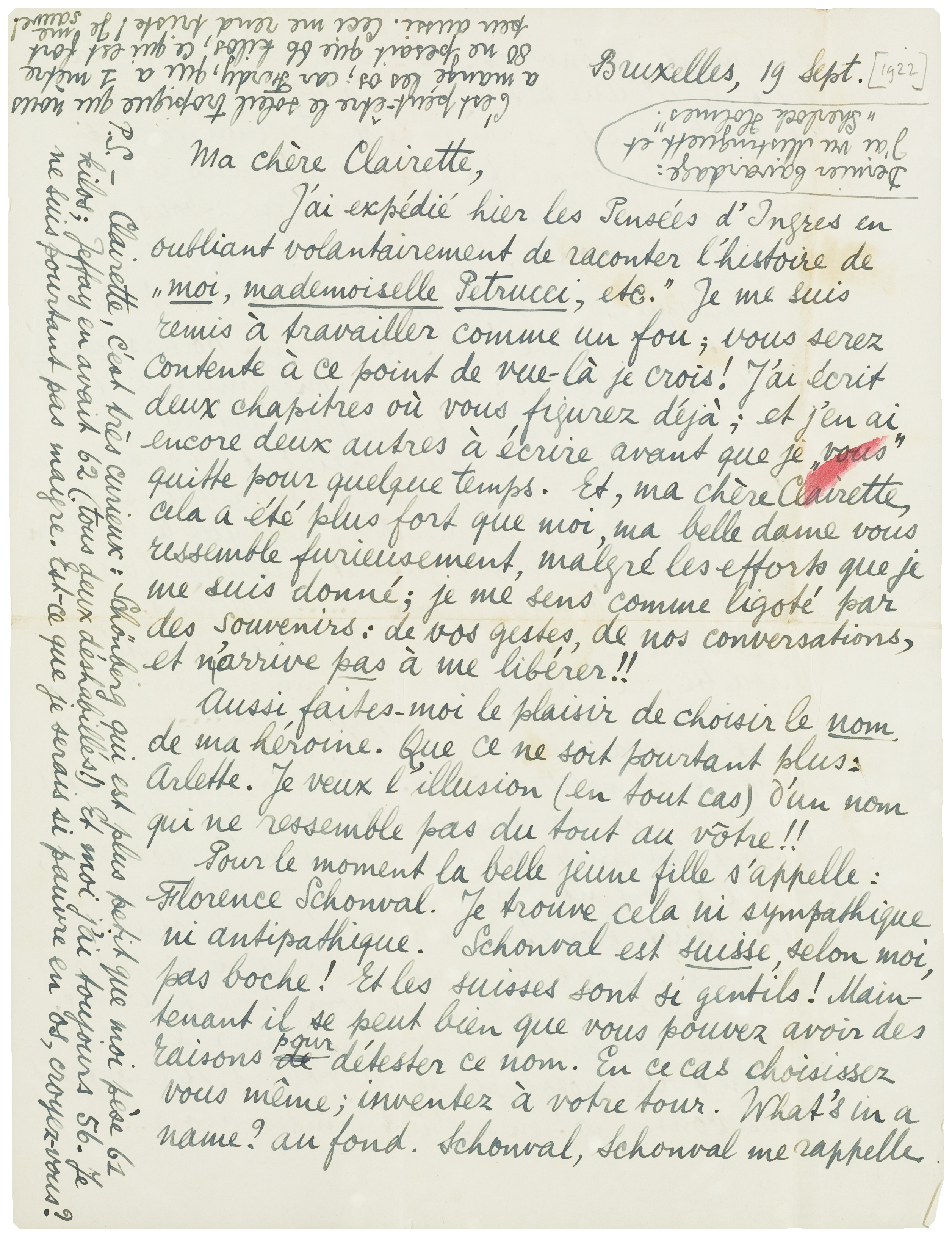 Alors: dites-moi ce que vous pensez de ‘Florence Schonval’; si ce nom éveille votre indignation envoyez moi un autre. Mais pas un nom italien; ce serait trop transparent! Et pas Dubois, Durand, Dupont, etc. Un bien joli nom qui dit quelque chose. Je pourrais très bien vous envoyer une liste de noms inventés et vous faire choisir, mais si vous le trouviez tout à fait seule ce me ferait plus plaisir. Vous serez plus la marraine de ma héroine, alors.
