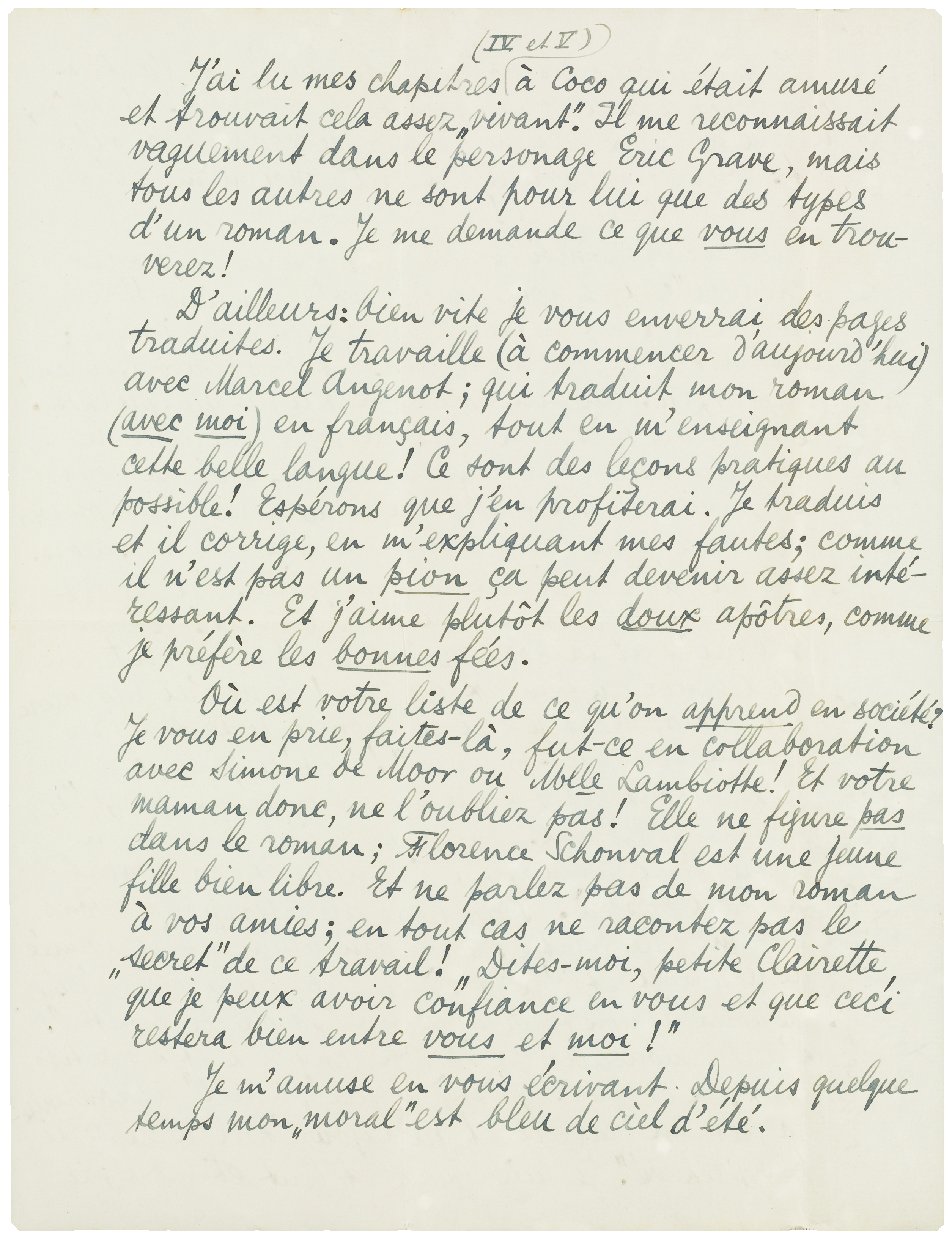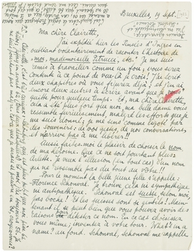 Où est votre liste de ce qu'on apprend en société? Je vous en prie, faites-là, fut-ce en collaboration avec Simone de Moor ou Mlle Lambiotte! Et votre maman donc, ne l'oubliez pas! Elle ne figure pas dans le roman; Florence Schonval est une jeune fille bien libre. Et ne parlez pas de mon roman à vos amies; en tout cas ne racontez pas le ‘secret’ de ce travail! ‘Dites-moi, petite Clairette, que je peux avoir confiance en vous et que ceci restera bien entre vous et moi!’