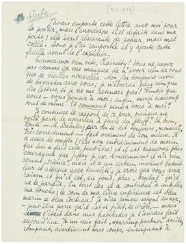 J'avais emporté cette lettre avec moi pour la poster, mais l'enveloppe s'est defaite dans ma poche; elle était résistante de papier, mais mal collée. Donc je l'ai remportée et y ajoute cette feuille avant de l'expédier.