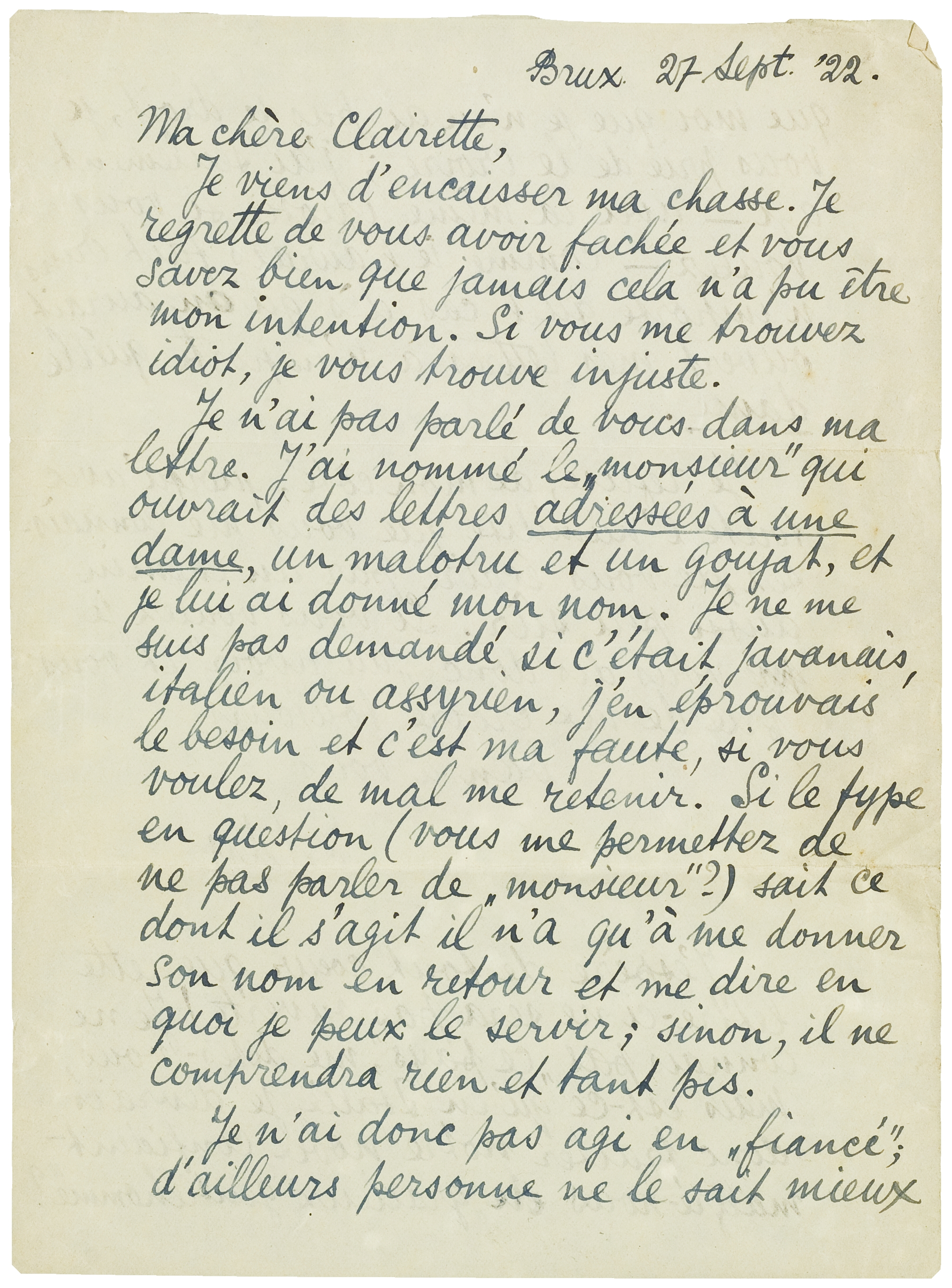 Je n'ai pas parlé de vous dans ma lettre. J'ai nommé le ‘monsieur’ qui ouvrait des lettres adressées à une dame, un malotru et un goujat, et je lui ai donné mon nom. Je ne me suis pas demandé si c'était javanais, italien ou assyrien, j'en éprouvais le besoin et c'est ma faute, si vous voulez, de mal me retenir. Si le type en question (vous me permettez de ne pas parler de ‘monsieur’?) sait ce dont il s'agit il n'a qu'à me donner son nom en retour et me dire en quoi je peux le servir; sinon, il ne comprendra rien et tant pis.