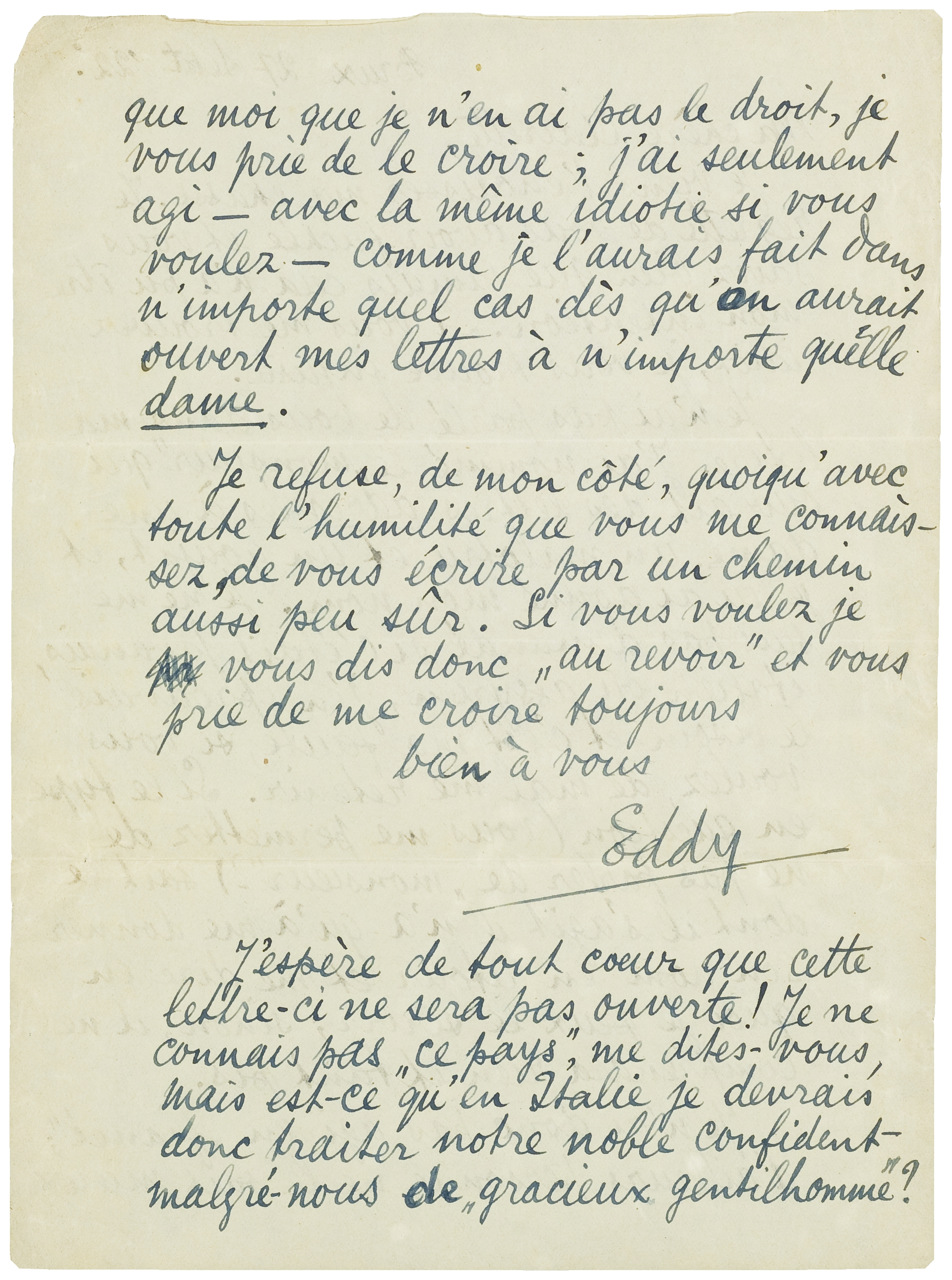 J'espère de tout coeur que cette lettre-ci ne sera pas ouverte! Je ne connais pas ‘ce pays’, me dites-vous, mais est-ce qu'en Italie je devrais donc traiter notre noble confident-malgré-nous de ‘gracieux gentilhomme’?