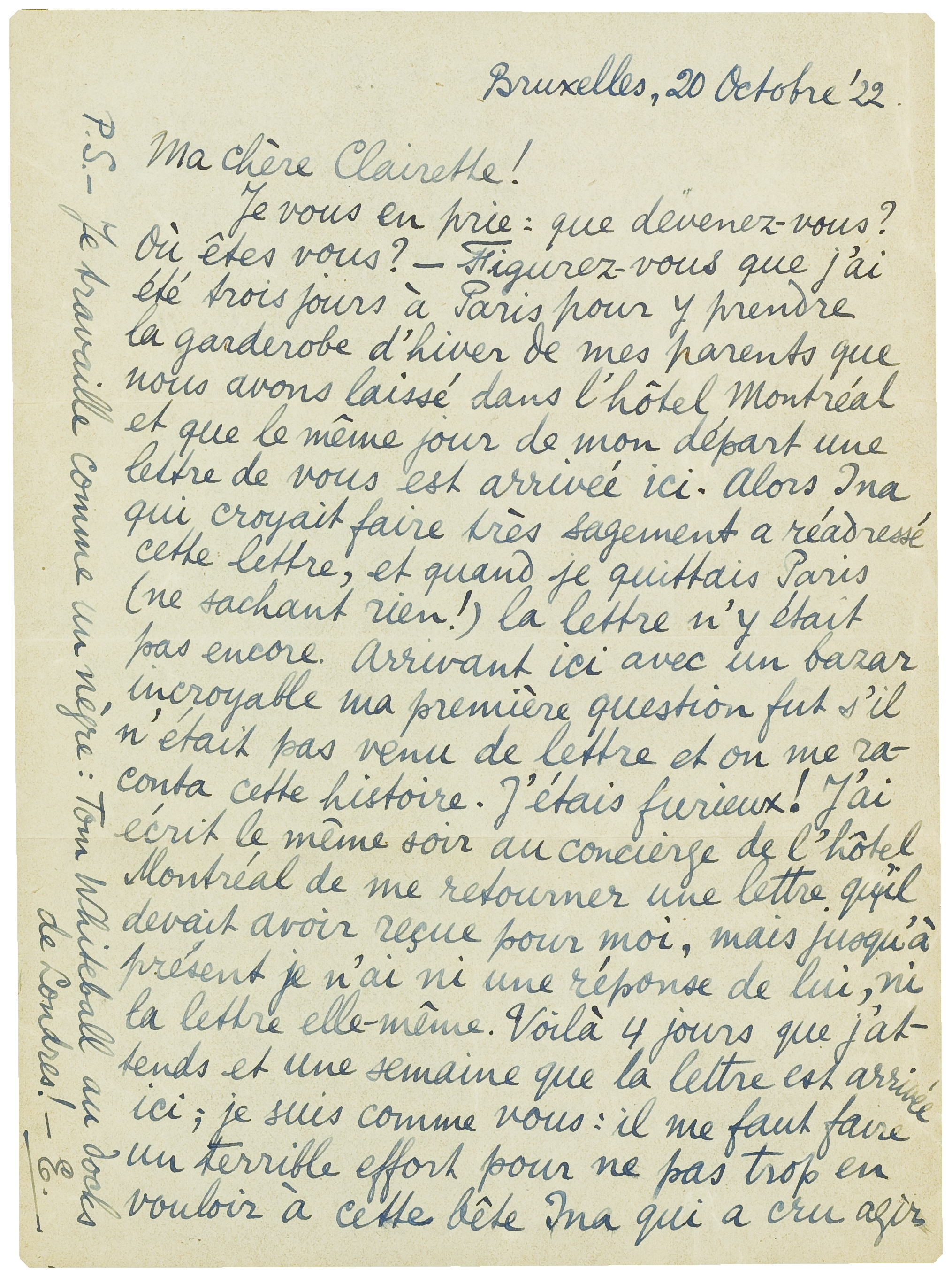 Je vous en prie: que devenez-vous? Où êtes-vous? - Figurez-vous que j'ai été trois jours à Paris pour y prendre la garderobe d'hiver de mes parents que nous avons laissé dans l'hôtel Montréal et que le même jour de mon départ une lettre de vous est arrivée ici. Alors Ina qui croyait faire très sagement a réadressé cette lettre, et quand je quittais Paris (ne sachant rien!) la lettre n'y était pas encore. Arrivant ici avec un bazar incroyable ma première question fut s'il n'était pas venu de lettre et on me raconta cette histoire. J'étais furieux! J'ai écrit le même soir au concierge de l'hôtel Montréal de me retourner une lettre qu'il devait avoir reçue pour moi, mais jusqu'à présent je n'ai ni une réponse de lui, ni la lettre elle-même. Voilà 4 jours que j'attends et une semaine que la lettre est arrivée ici; je suis comme vous: il me faut faire un terrible effort pour ne pas trop en vouloir à cette bête Ina qui a cru agir avec grande perspicacité!! oui, encore ça! -