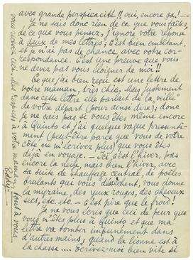 Ce que j'ai bien reçu est une lettre de votre maman, très chic. Mais justement dans cette lettre elle parlait de la ‘veille’ de votre départ (pour ainsi dire); donc je ne sais pas si vous êtes même encore à Quinto et j'ai quelque vague pressentiment (peut-être parce que vous de votre côté ne m'écrivez plus) que vous êtes déjà en voyage. - Ici c'est l'hiver, pas encore la neige, mais bien l'hiver, avec sa suite de chauffage central, de poêles brulants qui vous déssechent, vous donne la migraine, des yeux rouges, des cheveux secs, etc. etc. - c'est pire que le froid!
