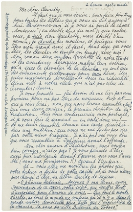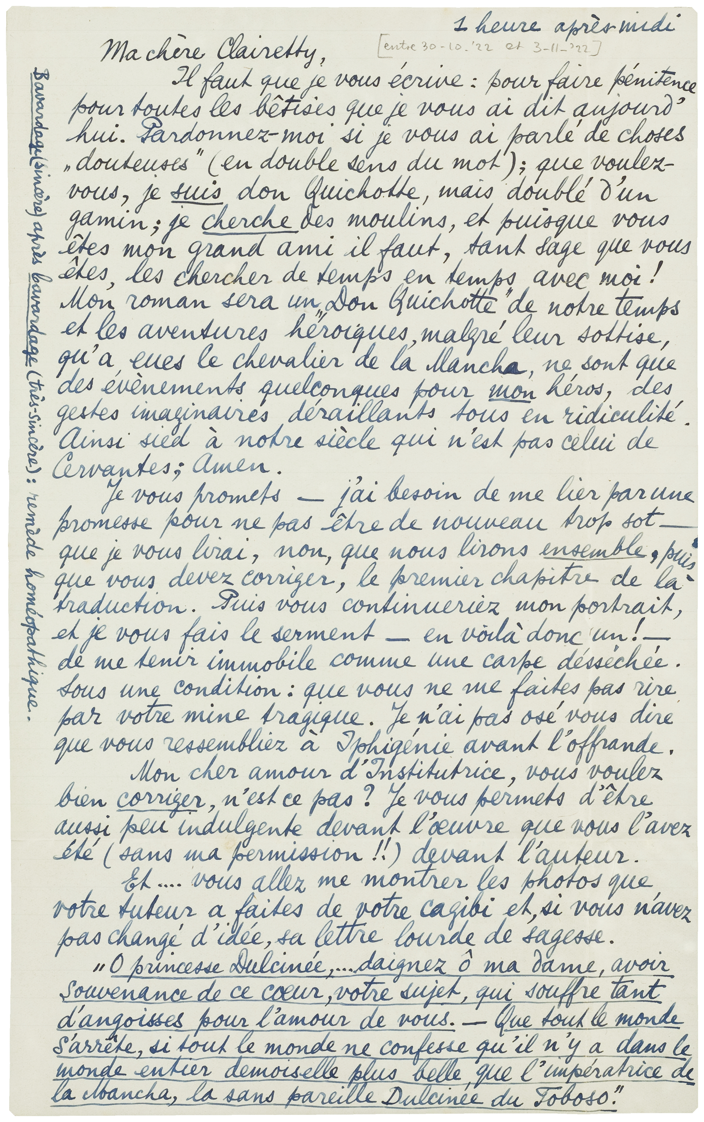Il faut que je vous écrive: pour faire pénitence pour toutes les bêtises que je vous ai dit aujourd'hui. Pardonnez-moi si je vous ai parlé de choses ‘douteuses’ (en double sens du mot); que voulez-vous, je suis don Quichotte, mais doublé d'un gamin; je cherche des moulins, et puisque vous êtes mon grand ami il faut, tant sage que vous êtes, les chercher de temps en temps avec moi! Mon roman sera un ‘Don Quichotte’ de notre temps et les aventures héroiques, malgré leur sottise, qu'a eues le chevalier de la Mancha, ne sont que des évènements quelconques pour mon héros, des gestes imaginaires, déraillants tous en ridiculité. Ainsi sied à notre siècle qui n'est pas celui de Cervantes; Amen.