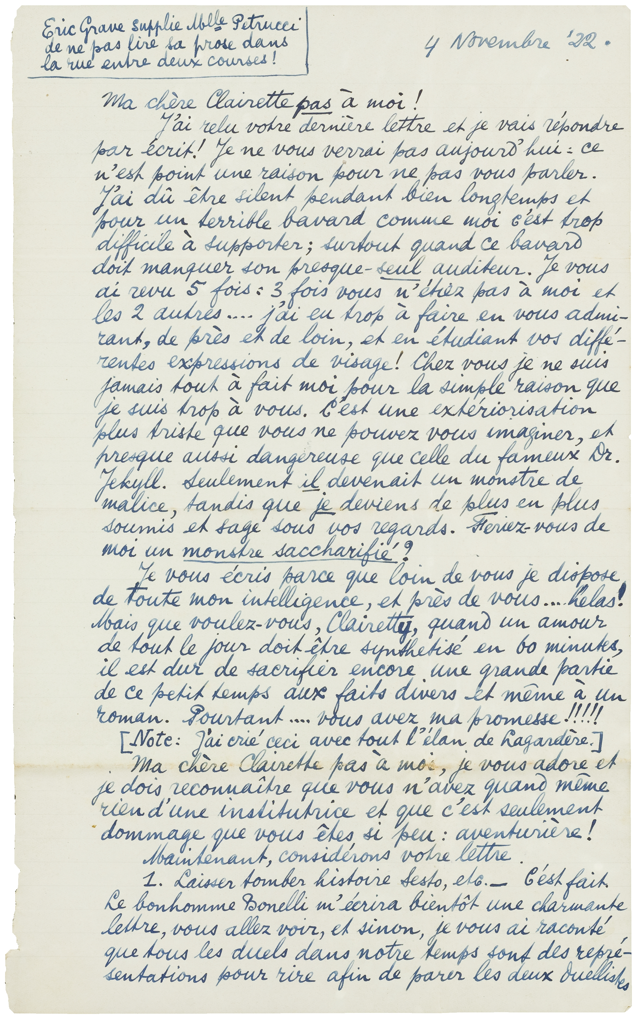 Je vous écris parce que loin de vous je dispose de toute mon intelligence, et près de vous... hélas! Mais que voulez-vous, Clairetty, quand un amour de tout le jour doit être synthétisé en 60 minutes, il est dur de sacrifier encore une grande partie de ce petit temps aux faits divers et même à un roman. Pourtant.... vous avez ma promesse!!!!!