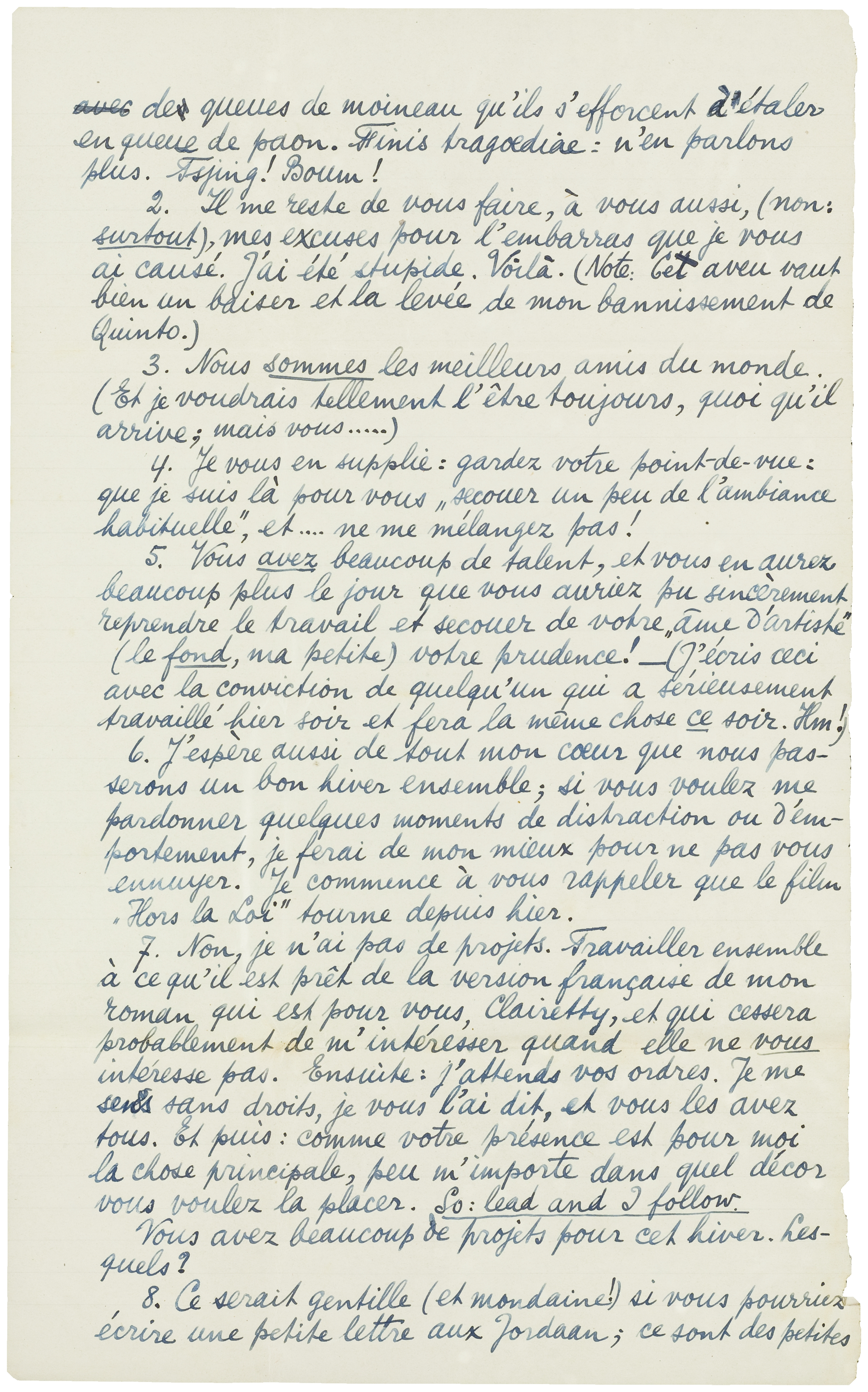| 7. | Non, je n'ai pas de projets. Travailler ensemble à ce qu'il est prêt de la version française de mon roman qui est pour vous, Clairetty, et qui cessera probablement de m'intéresser quand elle ne vous intéresse pas. Ensuite: j'attends vos ordres. Je me sens sans droits, je vous l'ai dit, et vous les avez tous. Et puis: comme votre présence est pour moi la chose principale, peu m'importe dans quel décor vous voulez la placer. So: lead and I follow.