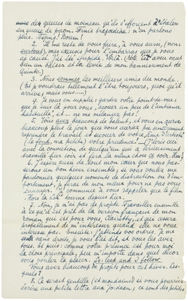 | 5. | Vous avez beaucoup de talent, et vous en aurez beaucoup plus le jour que vous auriez pu sincèrement reprendre le travail et secouer de votre ‘âme d'artiste’ (le fond, ma petite) votre prudence! - (J'écris ceci avec la conviction de quelqu'un qui a sérieusement travaillé hier soir et fera la même chose ce soir. Hm!) |