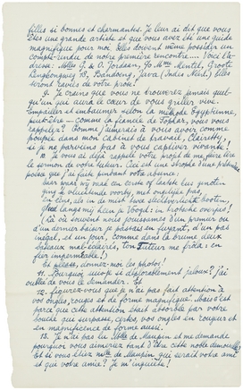 J'ai relu votre dernière lettre et je vais répondre par écrit! Je ne vous verrai pas aujourd'hui: ce n'est point une raison pour ne pas vous parler. J'ai dû être silent pendant bien longtemps et pour un terrible bavard comme moi c'est trop difficile à supporter; surtout quand ce bavard doit manquer son presque-seul auditeur. Je vous ai revu 5 fois: 3 fois vous n'étiez pas à moi et les 2 autres.... j'ai eu trop à faire en vous admirant, de près et de loin, et en étudiant vos différentes expressions de visage! Chez vous je ne suis jamais tout à fait moi pour la simple raison que je suis trop à vous. C'est une extériorisation plus triste que vous ne pouvez vous imaginer, et presque aussi dangereuse que celle du fameux Dr. Jekyll. Seulement il devenait un monstre de malice, tandis que je deviens de plus en plus soumis et sage sous vos regards. Feriez-vous de moi un monstre saccharifié?