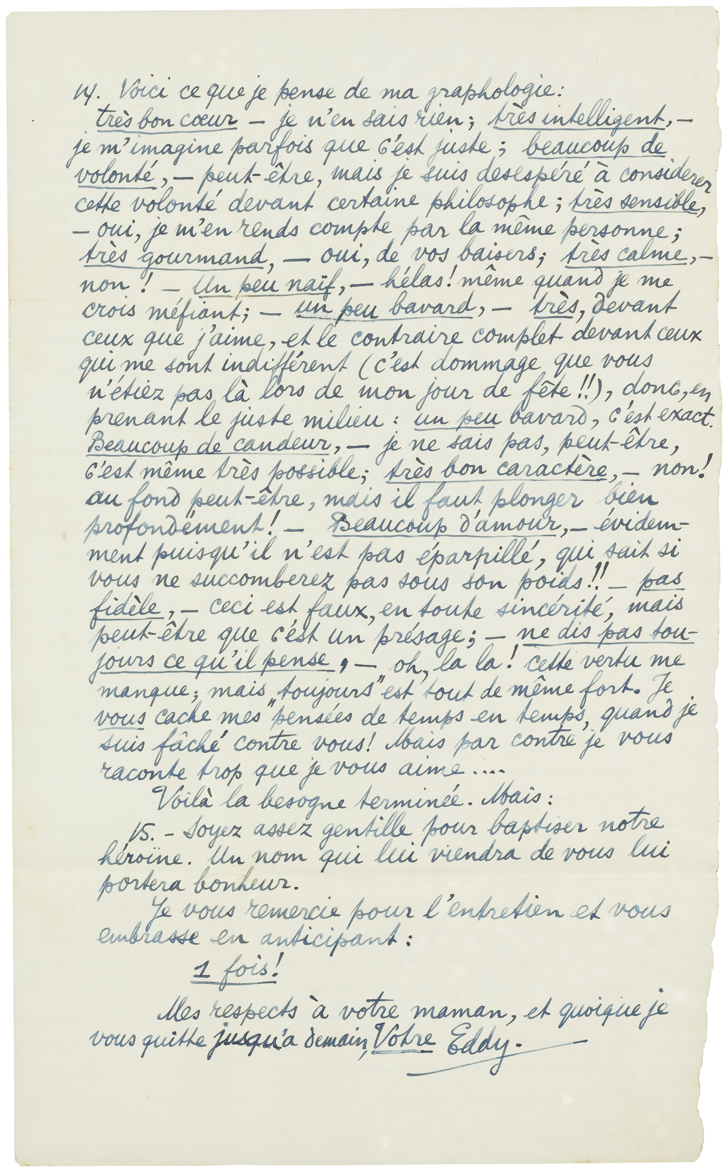 très bon coeur - je n'en sais rien; très intelligent, - je m'imagine parfois que c'est juste; beaucoup de volonté, - peut-être, mais je suis desespéré à considérer cette volonté devant certaine philosophe; très sensible, - oui, je m'en rends compte par la même personne; très gourmand, - oui, de vos baisers; très calme, - non! - Un peu naïf, - hélas! même quand je me crois méfiant; - un peu bavard, - très, devant ceux que j'aime, et le contraire complet devant ceux qui me sont indifférent (c'est dommage que vous n'étiez pas là lors de mon jour de fête!!), donc, en prenant le juste milieu: un peu bavard, c'est exact. Beaucoup de candeur, - je ne sais pas, peut-être, c'est même très possible; très bon caractère, - non! au fond peut-être, mais il faut plonger bien profondément! - Beaucoup d'amour, - évidemment puisqu'il n'est pas éparpillé, qui sait si vous ne succomberez pas sous son poids!! - pas fidèle, - ceci est faux, en toute sincérité, mais peut-être que c'est un présage; - ne dis pas toujours ce qu'il pense, - oh, la la! cette vertu me manque; mais ‘toujours’ est tout de même fort. Je vous cache mes pensées de temps en temps, quand je suis fâché contre vous! Mais par contre je vous raconte trop que je vous aime.... Voilà la besogne terminée. Mais: |