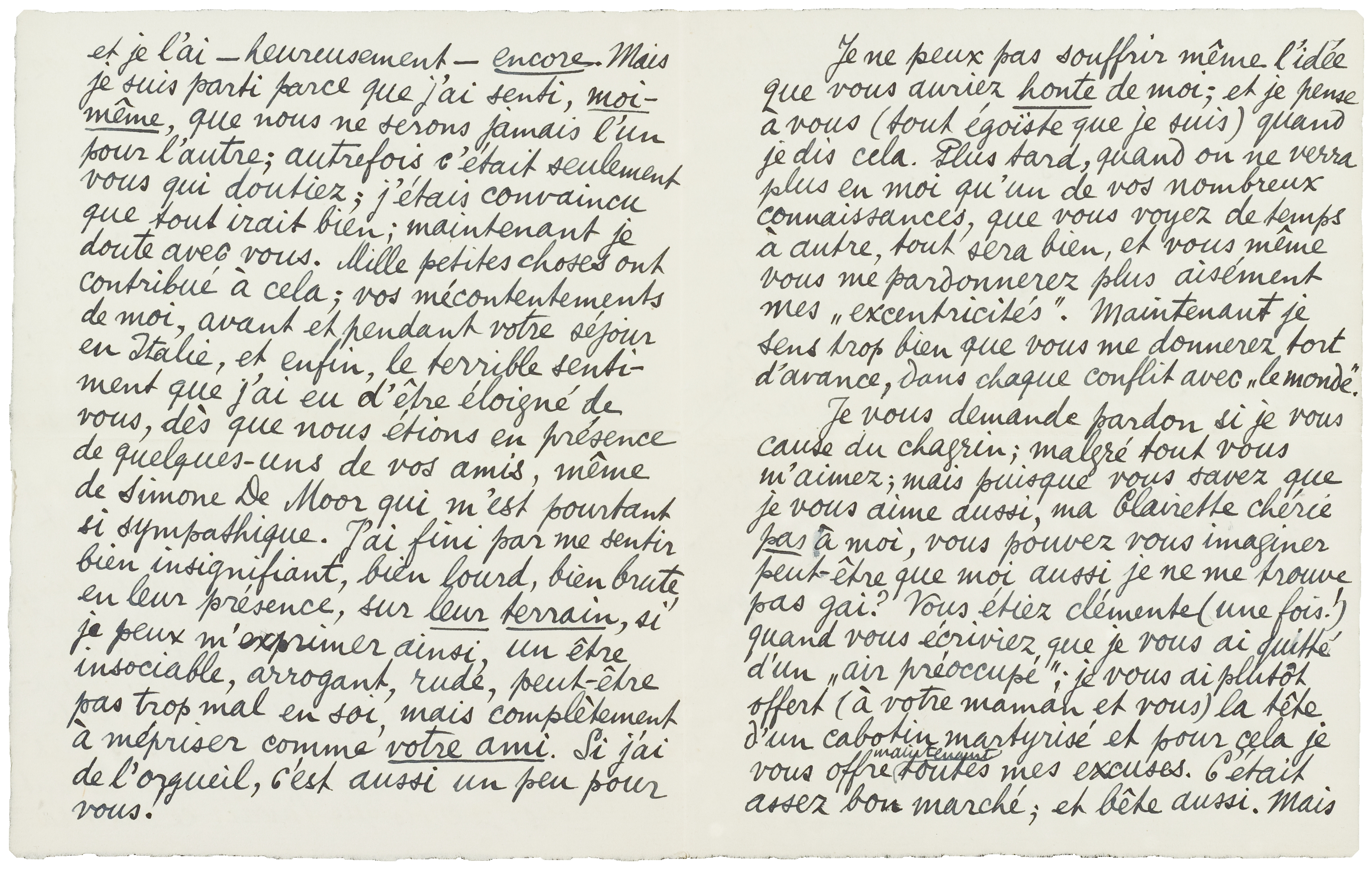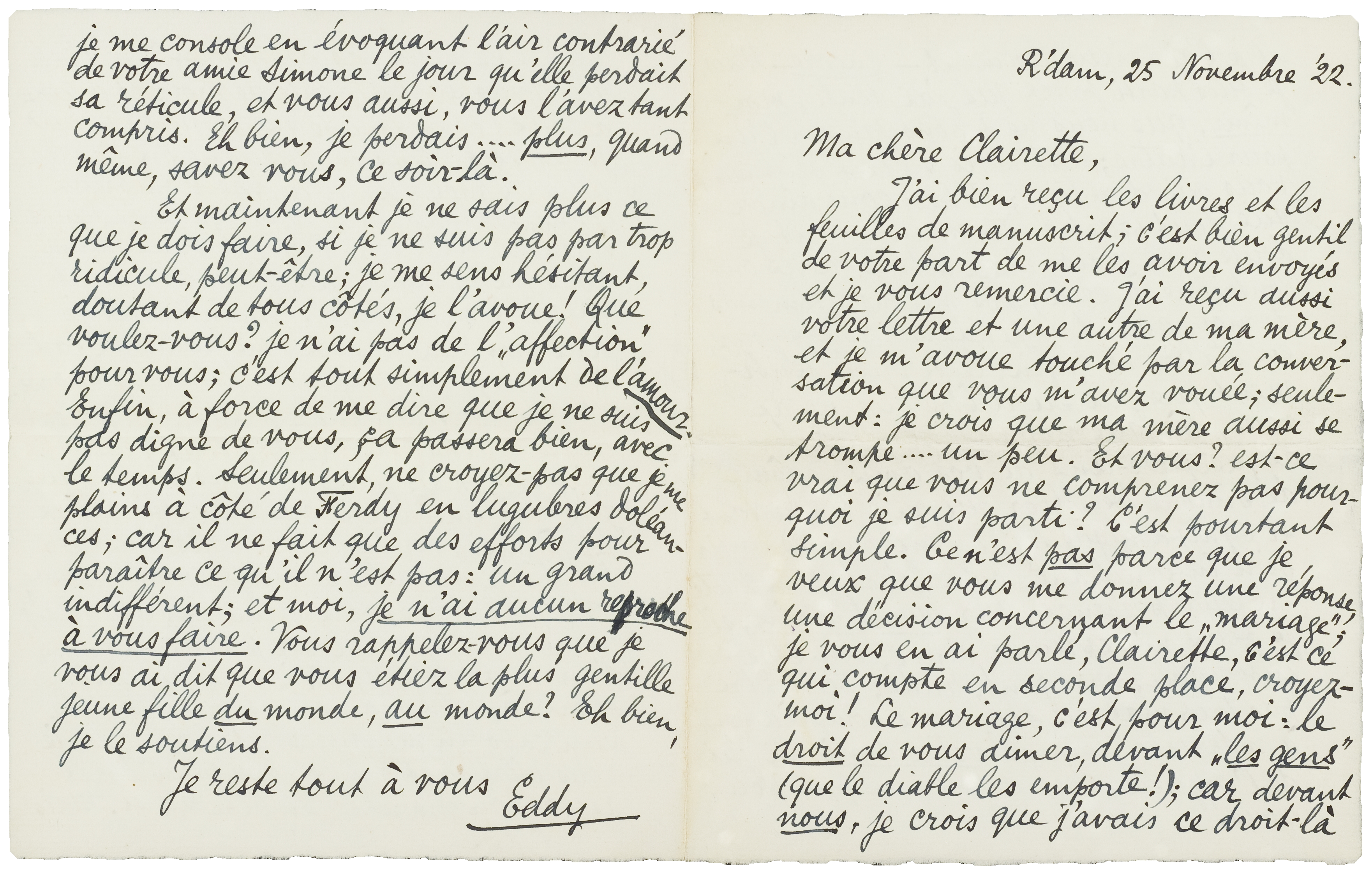 Je vous demande pardon si je vous cause du chagrin; malgré tout vous m'aimez; mais puisque vous savez que je vous aime aussi, ma Clairette chérie pas à moi, vous pouvez vous imaginer peut-être que moi aussi je ne me trouve pas gai? Vous étiez clémente (une fois!) quand vous écriviez que je vous ai quitté d'un ‘air préoccupé’; je vous ai plutôt offert (à votre maman et vous) la tête d'un cabotin martyrisé et pour cela je vous offre maintenant toutes mes excuses. C'était assez bon marché; et bête aussi. Mais je me console en évoquant l'air contrarié de votre amie Simone le jour qu'elle perdait sa réticule, et vous aussi vous l'avez tant compris. Eh bien, je perdais.... plus, quand même, savez vous, ce soir-là.