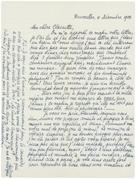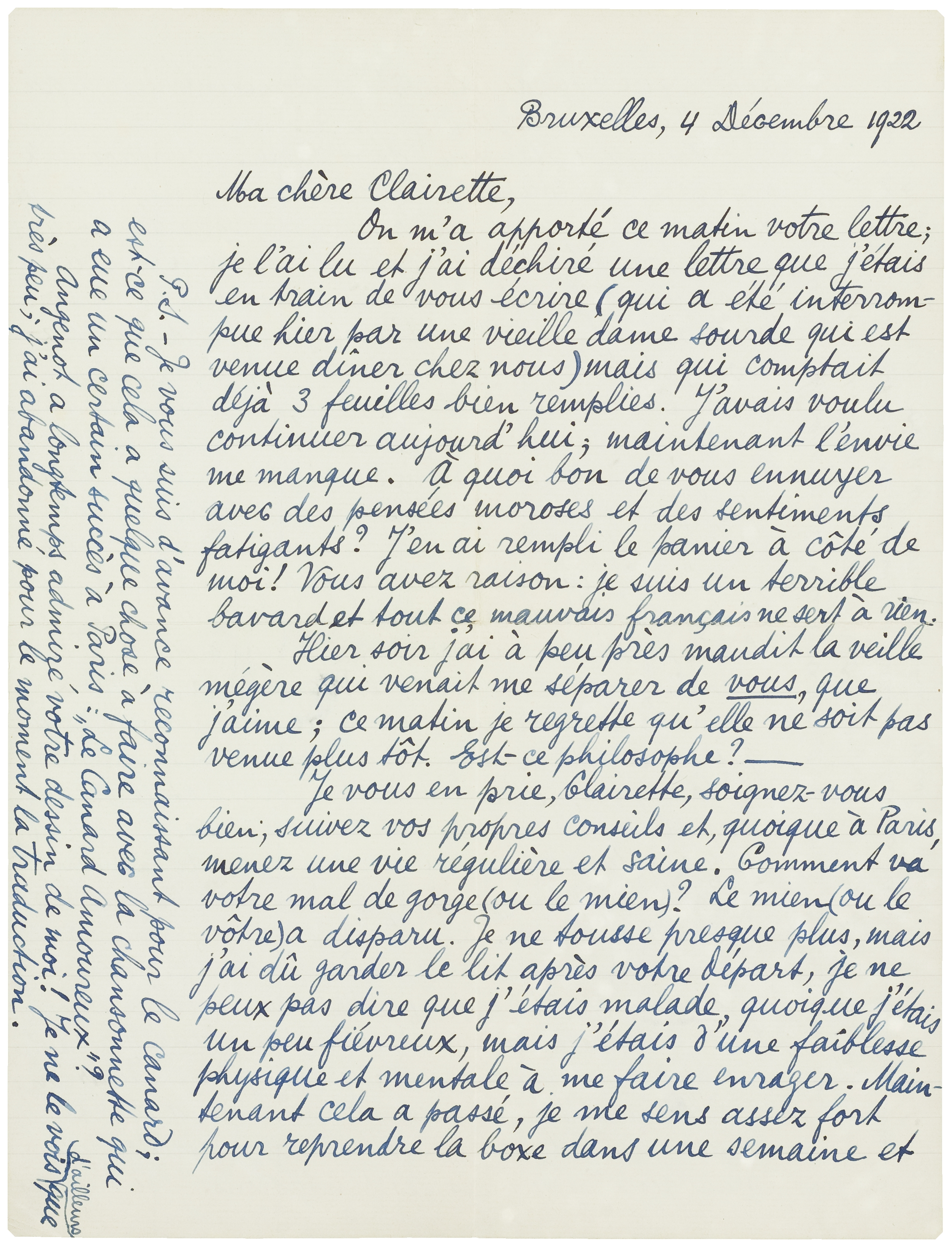 Je vous en prie, Clairette, soignez-vous bien; suivez vos propres conseils et, quoique à Paris, menez une vie régulière et saine. Comment va votre mal de gorge (ou le mien)? Le mien (ou le vôtre) a disparu. Je ne tousse presque plus, mais j'ai dû garder le lit après votre départ, je ne peux pas dire que j'étais malade, quoique j'étais un peu fiévreux, mais j'étais d'une faiblesse physique et mentale à me faire enrager. Maintenant cela a passé, je me sens assez fort pour reprendre la boxe dans une semaine et j'espère que j'aurai bientôt la force intérieure qui s'appelle, je crois: ‘indifférence’.