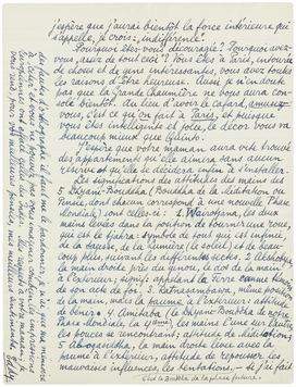 Pourquoi êtes-vous découragée? Pourquoi avez vous ‘assez de tout ceci’? Vous êtes à Paris, entourée de choses et de gens intéressantes, vous avez toutes les raisons d'être heureuse. Aussi je n'en doute pas que la Grande Chaumière ne vous aura consolé bientôt. Au lieu d'avoir le cafard, amusez-vous, c'est ce qu'on fait à Paris, et puisque vous êtes intelligente et jolie, le décor vous va beaucoup mieux que Quinto.