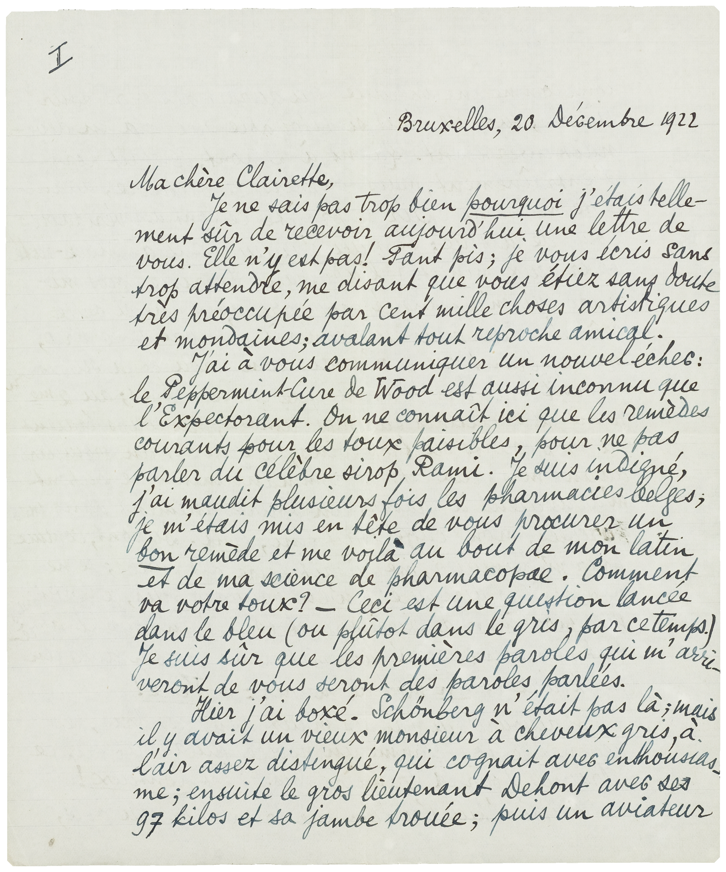 J'ai à vous communiquer un nouvel échec: le Peppermint-Cure de Wood est aussi inconnu que l'Expectorant. On ne connaît ici que les remèdes courants pour les toux paisibles, pour ne pas parler du célèbre sirop Rami. Je suis indigné, j'ai maudit plusieurs fois les pharmacies belges; je m'étais mis en tête de vous procurer un bon remède et me voilà au bout de mon latin et de ma science de pharmacopae. Comment va votre toux? - Ceci est une question lancée dans le bleu (ou plûtot dans le gris, par ce temps). Je suis sûr que les premières paroles qui m'arriveront de vous seront des paroles parlées.