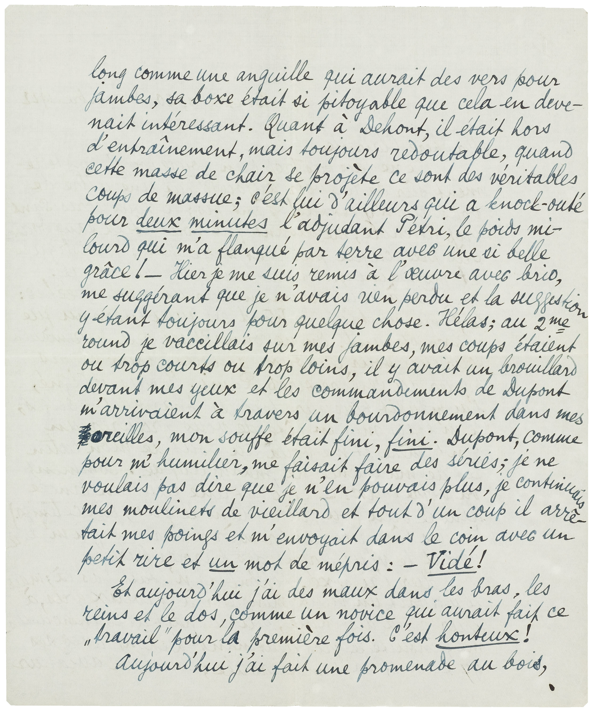 Hier j'ai boxé. Schönberg n'était pas là; mais il y avait là un vieux monsieur à cheveux gris, à l'air assez distingué, qui cognait avec enthousiasme; ensuite le gros lieutenant Dehont avec ses 97 kilos et sa jambe trouée; puis un aviateur long comme une anguille qui aurait des vers pour jambes, sa boxe était si pitoyable que cela en devenait intéressant. Quant à Dehont, il était hors d'entraînement, mais toujours redoutable, quand cette masse de chair se projète ce sont de véritables coups de massue; c'est lui d'ailleurs qui a knock-outé pour deux minutes l'adjudant Pétri, le poids mi-lourd qui m'a flanqué par terre avec une si belle grâce! - Hier je me suis remis à l'oeuvre avec brio, me suggérant que je n'avais rien perdu et la suggestion y étant toujours pour quelque chose. Hélas; au 2me round je vaccillais sur mes jambes, mes coups étaient ou trop courts ou trop loins, il y avait un brouillard devant mes yeux et les commandements de Dupont m'arrivaient à travers un bourdonnement dans mes oreilles, mon souffle était fini, fini. Dupont, comme pour m'humilier, me faisait faire des séries; je ne voulais pas dire que je n'en pouvais plus, je continuais mes moulinets de vieillard et tout d'un coup il arrêtait mes poings et m'envoyait dans le coin avec un petit rire et un mot de mépris: - Vidé!