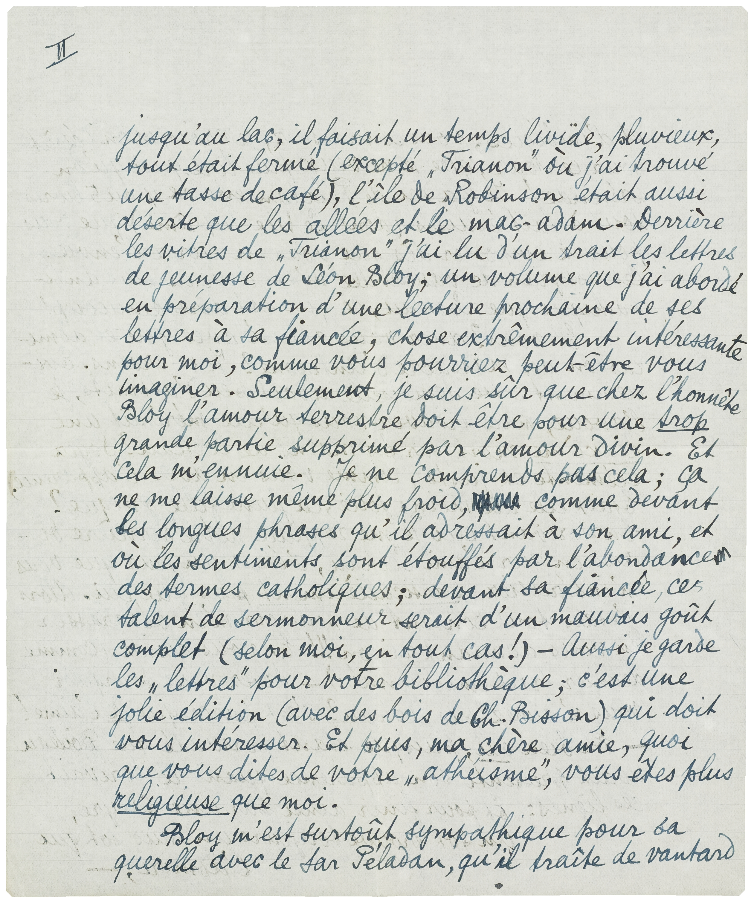 Aujourd'hui j'ai fait une promenade au bois, jusqu'au lac, il faisait un temps livide, pluvieux, tout était fermé (excepté ‘Trianon’ où j'ai trouvé une tasse de café), l'île de Robinson était aussi déserte que les allées et le mac-adam. Derrière les vitres de ‘Trianon’ j'ai lu d'un trait les lettres de jeunesse de Léon Bloy; un volume que j'ai abordé en préparation d'une lecture prochaine de ses lettres à sa fiancée, chose extrêmement intéressante pour moi, comme vous pourriez peut-être vous imaginer. Seulement, je suis sûr que chez l'honnête Bloy l'amour terrestre doit être pour une trop grande partie supprimé par l'amour Divin. Et cela m'ennuie. Je ne comprends pas cela; ça ne me laisse même plus froid, comme devant les longues phrases qu'il adressait à son ami, et où les sentiments sont étouffés par l'abondance des termes catholiques; devant sa fiancée, ce talent de sermonneur serait d'un mauvais goût complet (selon moi, en tout cas!) - Aussi je garde les ‘lettres’ pour votre bibliothèque; c'est une jolie édition (avec des bois de Ch. Bisson) qui doit vous intéresser. Et puis, ma chère amie, quoi que vous dites de votre ‘athéisme’, vous êtes plus religieuse que moi.