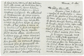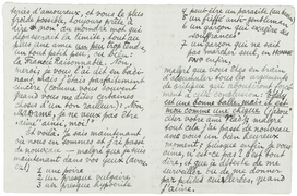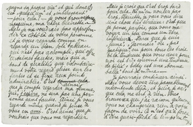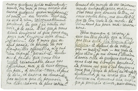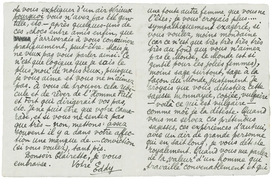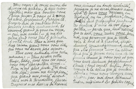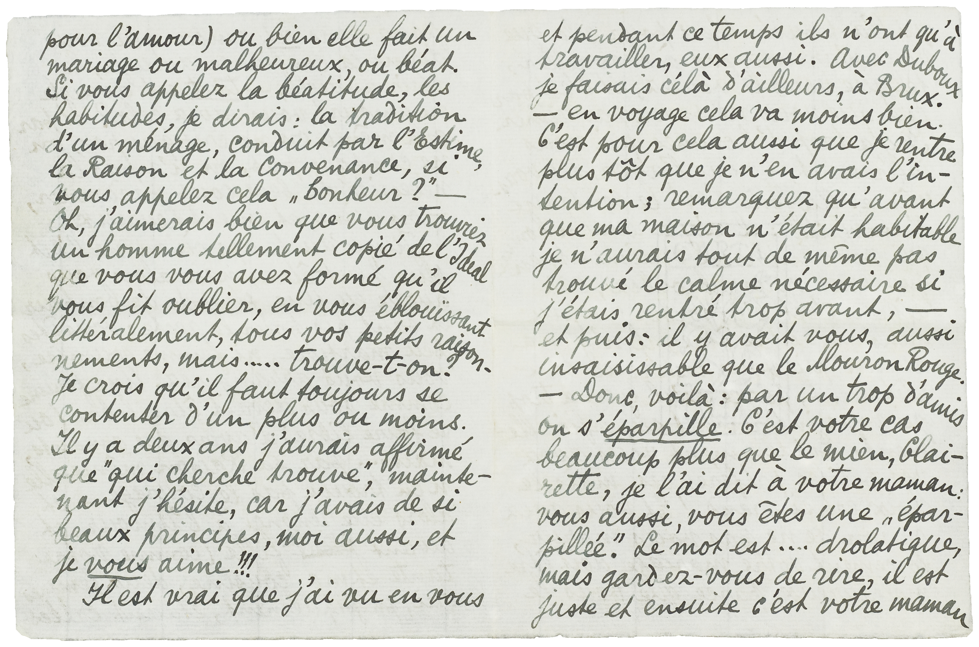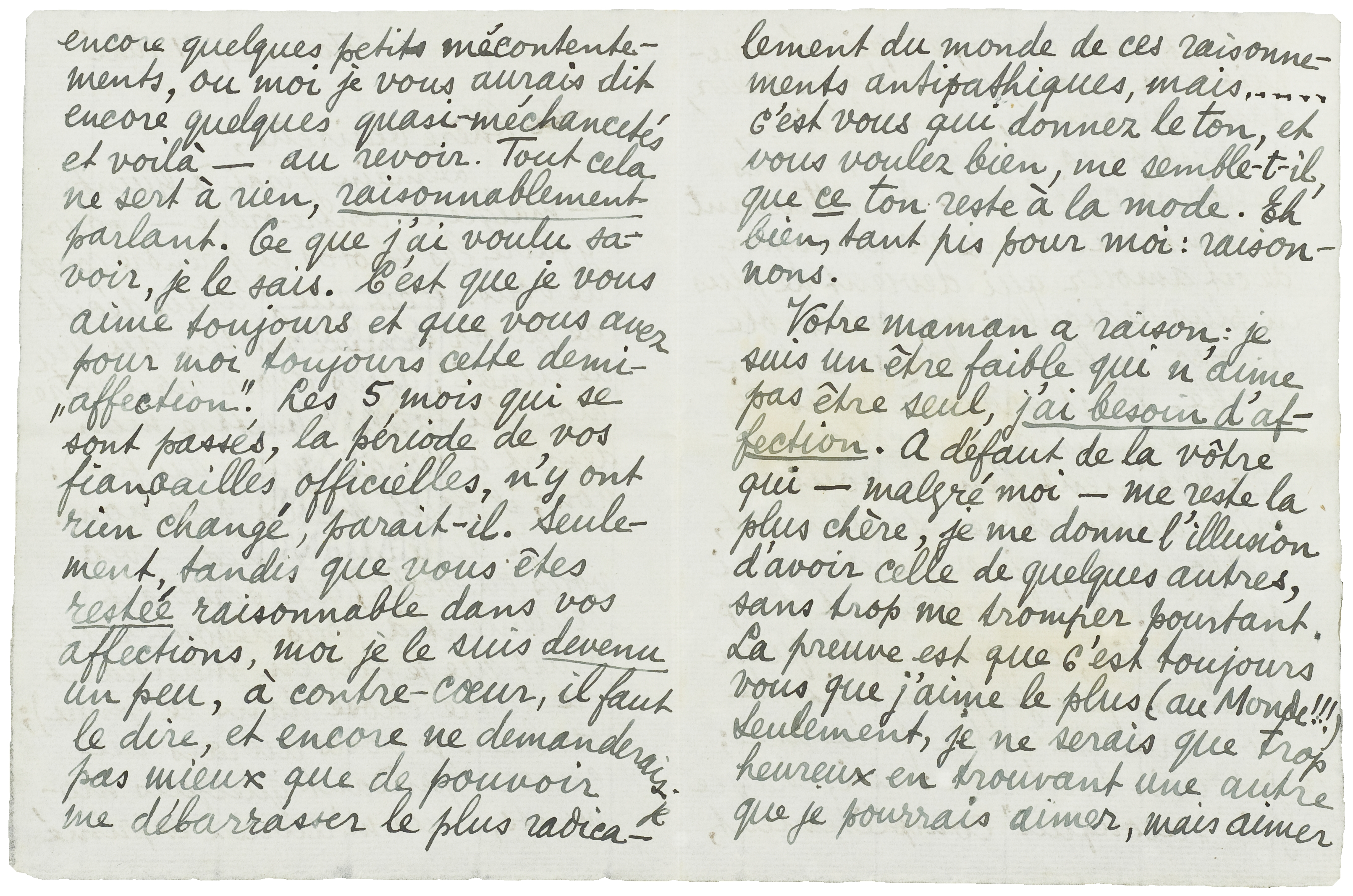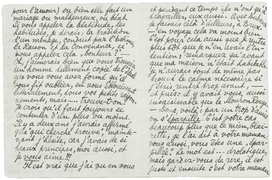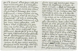 Je dinerais samedi avec vous en ville (cela servirait seulement à vous dégouter du bruit que je fais en mangeant ou autre chose dans ce genre); ou bien je vous aurais vu encore pendant quelques moments, vous m'auriez exprimé encore quelques petits mécontentements, ou moi je vous aurais dit encore quelques quasi-méchancetés et voilà - au revoir. Tout cela ne sert à rien, raisonnablement parlant. Ce que j'ai voulu savoir, je le sais. C'est que je vous aime toujours et que vous avez pour moi toujours cette demi-‘affection’. Les 5 mois qui se sont passés, la période de vos fiançailles officielles, n'y ont rien changé, parait-il. Seulement, tandis que vous êtes restée raisonnable dans vos affections, moi je le suis devenu un peu, à contre-coeur, il faut le dire, et encore ne demanderais-je pas mieux que de pouvoir me débarrasser le plus radicalement du monde de ces raisonnements antipathiques, mais...... c'est vous qui donnez le ton, et vous voulez bien, me semble-t-il, que ce ton reste à la mode. Eh bien, tant pis pour moi: raisonnons.