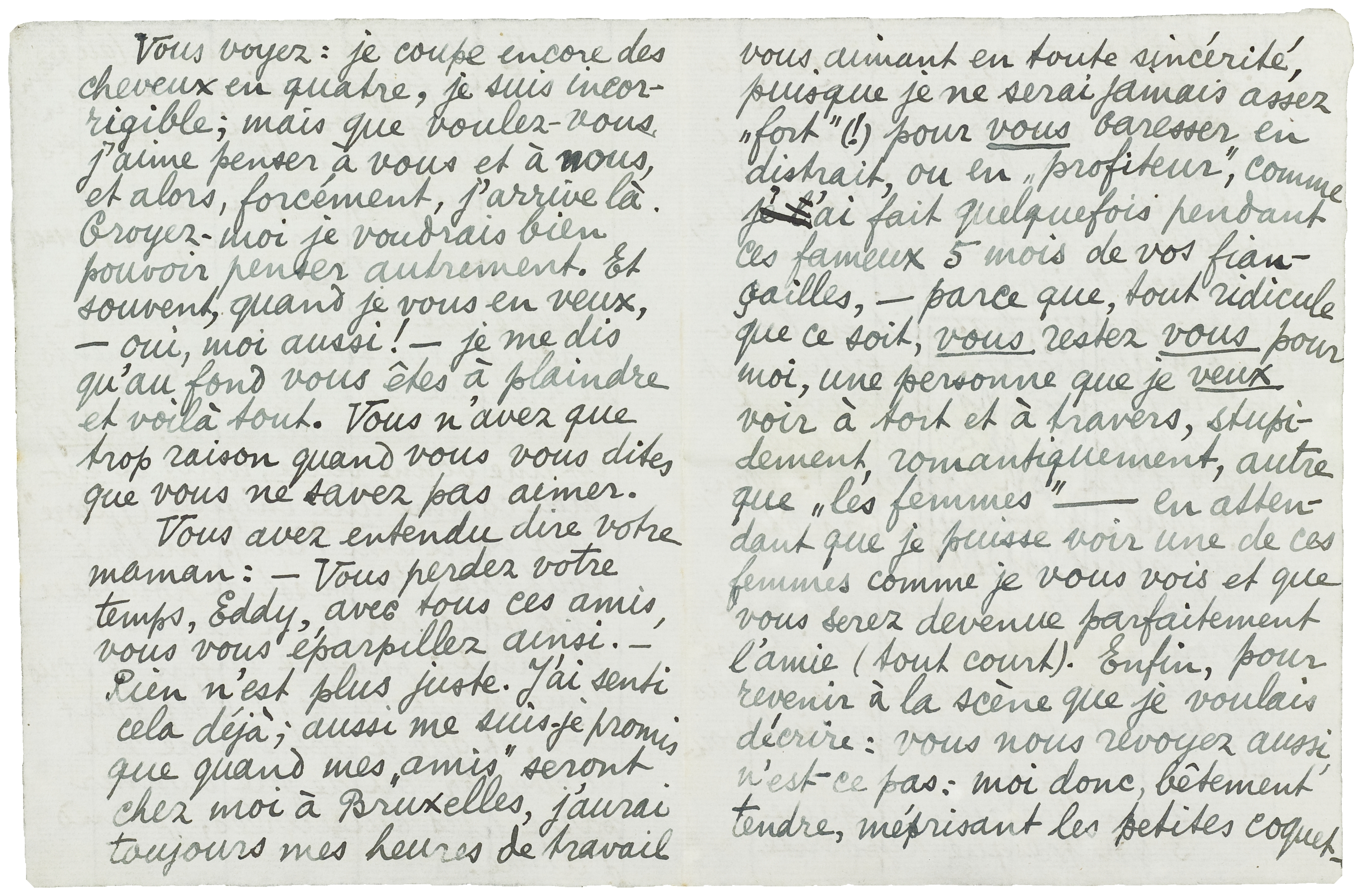 Vous avez entendu dire votre maman: - Vous perdez votre temps, Eddy, avec tous ces amis, vous vous éparpillez ainsi. - Rien n'est plus juste. J'ai senti cela déjà; aussi me suis-je promis que quand mes ‘amis’ seront chez moi à Bruxelles, j'aurai toujours mes heures de travail et pendant ce temps ils n'ont qu'à travailler, eux aussi. Avec Duboux je faisais celà d'ailleurs, à Brux. - en voyage cela va moins bien. C'est pour cela aussi que je rentre plus tôt que je n'en avais l'intention; remarquez qu'avant que ma maison n'était habitable je n'aurais tout de même pas trouvé le calme nécessaire si j'étais rentré trop avant, - et puis: il y avait vous, aussi insaisissable que le Mouron Rouge. - Donc, voilà: par un trop d'amis on s'éparpille. C'est votre cas beaucoup plus que le mien, Clairette, je l'ai dit à votre maman: vous aussi, vous êtes une ‘éparpillée’. Le mot est.... drolatique, mais gardez-vous de rire, il est juste et ensuite c'est votre maman qui l'a trouvé. C'est pour cela que vous n'arrivez pas à travailler, tel que vous le voulez, et c'est par cela que vous ne savez pas aimer. Il y a trop d'hommes qui vous intéressent, - vous l'avez dit vous-même. Au fond c'est le contraire d'une vérité: il n'y a aucun homme qui vous intéresse vraiment, en qui vous vous absorbez, car aimer c'est s'absorber un peu dans un autre être, il n'y en a aucun qui vous intéresse complètement, parce qu'il y en a trop qui vous intéressent superficiellement. Evidemment vous avez vos petites préférences, mais le choix est si grand! Et vous avez raison de ne pas vous marier, forcément votre mariage doit être malheureux, parce que vous le feriez sans cet amour qui vous donne la confiance aveugle, le désir aveugle, - tout est aveugle en amour, vous savez cela? et par cela même on ne critique pas, on ne compare pas, on n'a pas la nécessité de beaucoup pardonner, - on aime, et on est heureux.