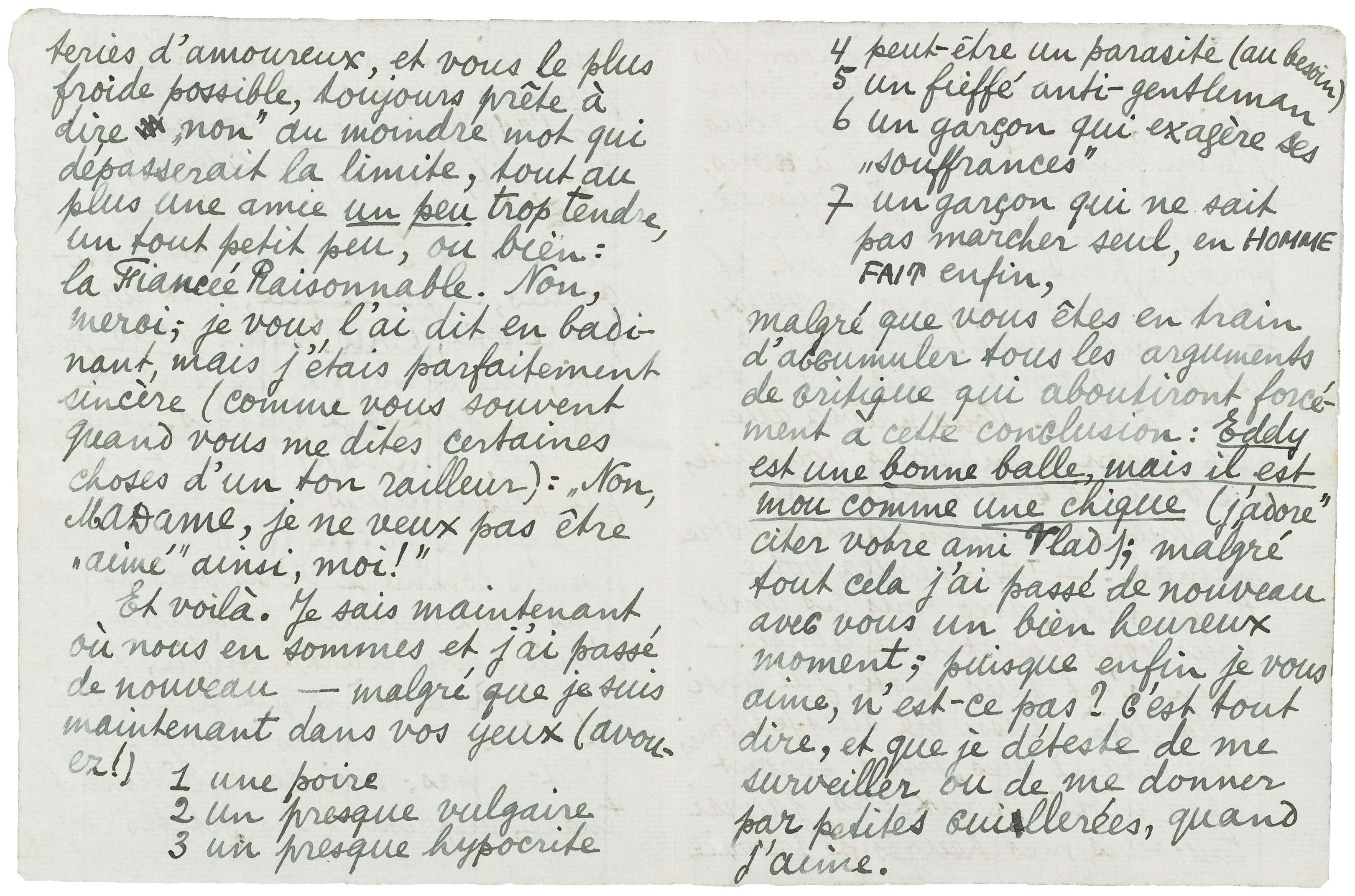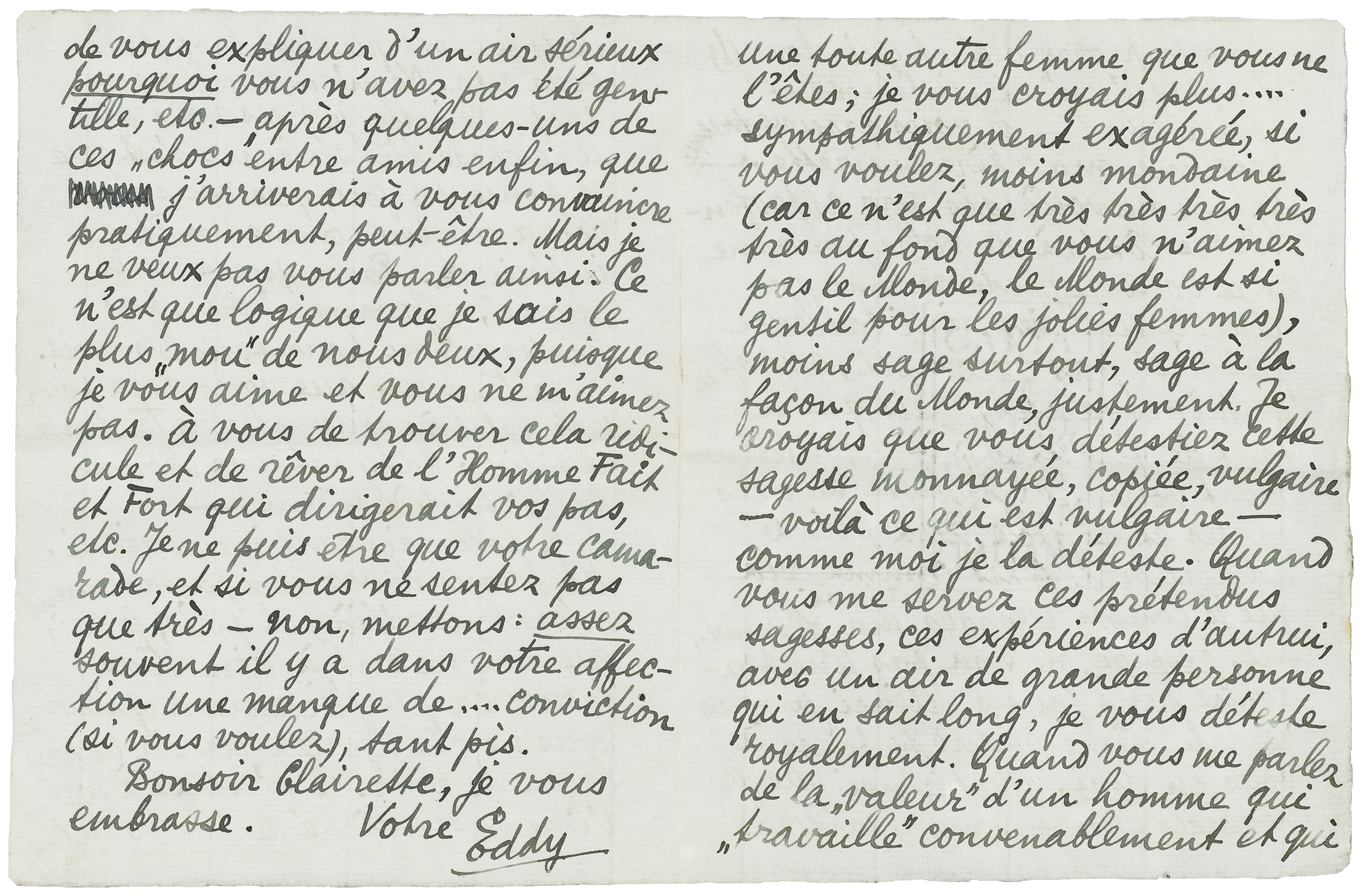 | 7 | un garçon qui ne sait pas marcher seul, en HOMME FAIT enfin, malgré que vous êtes en train d'accumuler tous les arguments de critique qui aboutiront forcément à cette conclusion: Eddy est une bonne balle, mais il est mou comme une chique (j'‘adore’ citer votre ami Vlad); malgré tout cela j'ai passé de nouveau avec vous un bien heureux moment; puisque enfin je vous aime, n'est-ce pas? c'est tout dire, et que je déteste de me surveiller ou de me donner par petites cuillerées, quand j'aime. |