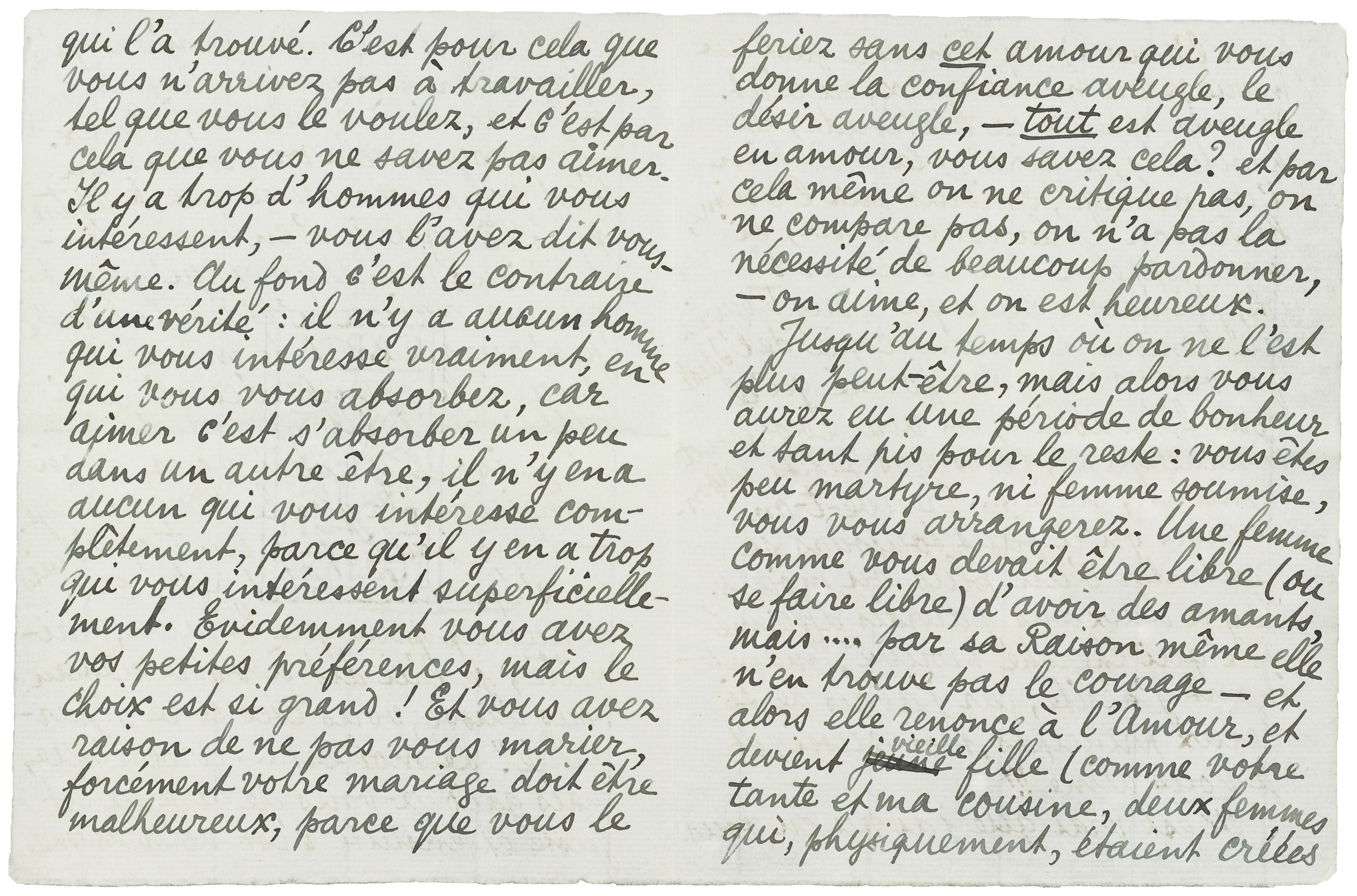 Jusqu'au temps où on ne l'est plus peut-être, mais alors vous aurez eu une période de bonheur et tant pis pour le reste: vous êtes peu martyre, ni femme soumise, vous vous arrangerez. Une femme comme vous devait être libre (ou se faire libre) d'avoir des amants, mais.... par sa Raison même elle n'en trouve pas le courage - et alors elle renonce à l'Amour, et devient vieille fille (comme votre tante et ma cousine, deux femmes qui, physiquement, étaient créées pour l'amour) ou bien elle fait un mariage ou malheureux, ou béat. Si vous appelez la béatitude, les habitudes, je dirais: la tradition d'un ménage, conduit par l'Estime, la Raison et la Convenance, si vous appelez cela ‘Bonheur?’ - Oh, j'aimerais bien que vous trouviez un homme tellement copié de l'Ideal que vous vous avez formé qu'il vous fit oublier, en vous éblouissant littéralement, tous vos petits raisonnements, mais..... trouve-t-on? Je crois qu'il faut toujours se contenter d'un plus ou moins. Il y a deux ans j'aurais affirmé que ‘qui cherche trouve’, maintenant j'hésite, car j'avais de si beaux principes, moi aussi, et je vous aime!!!