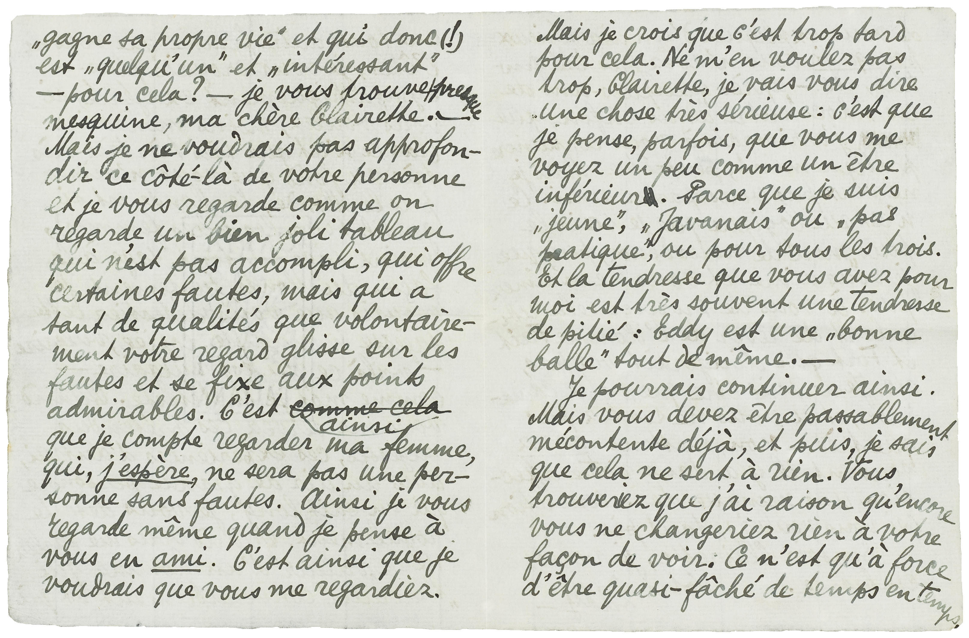 Il est vrai que j'ai vu en vous une toute autre femme que vous ne l'êtes; je vous croyais plus.... sympathiquement exagérée, si vous voulez, moins mondaine (car ce n'est que très très très très très au fond que vous n'aimez pas le Monde, le Monde est si gentil pour les jolies femmes), moins sage surtout, sage à la façon du Monde, justement. Je croyais que vous détestiez cette sagesse monnayée, copiée, vulgaire - voilà ce qui est vulgaire - comme moi je la déteste. Quand vous me servez ces prétendus sagesses, ces expériences d'autrui, avec un air de grande personne qui en sait long, je vous déteste royalement. Quand vous me parlez de la ‘valeur’ d'un homme qui ‘travaille’ convenablement et qui ‘gagne sa propre vie’ et qui donc (!) est ‘quelqu'un’ et ‘intéressant’ - pour cela? - je vous trouve presque mesquine, ma chère Clairette? Mais je ne voudrais pas approfondir ce côté-là de votre personne et je vous regarde comme on regarde un bien joli tableau qui n'est pas accompli, qui offre certaines fautes, mais qui a tant de qualités que volontairement votre regard glisse sur les fautes et se fixe aux points admirables. C'est ainsi que je compte regarder ma femme, qui, j'espère, ne sera pas une personne sans fautes. Ainsi je vous regarde même quand je pense à vous en ami. C'est ainsi que je voudrais que vous me regardiez. Mais je crois que c'est trop tard pour cela. Ne m'en voulez pas trop, Clairette, je vais vous dire une chose très sérieuse: c'est que je pense, parfois, que vous me voyez comme un être inférieur. Parce que je suis ‘jeune’, ‘Javanais’ ou ‘pas pratique’, ou pour tous les trois. Et la tendresse que vous avez pour moi est très souvent une tendresse de pitié: Eddy est une ‘bonne balle’ tout de même. -