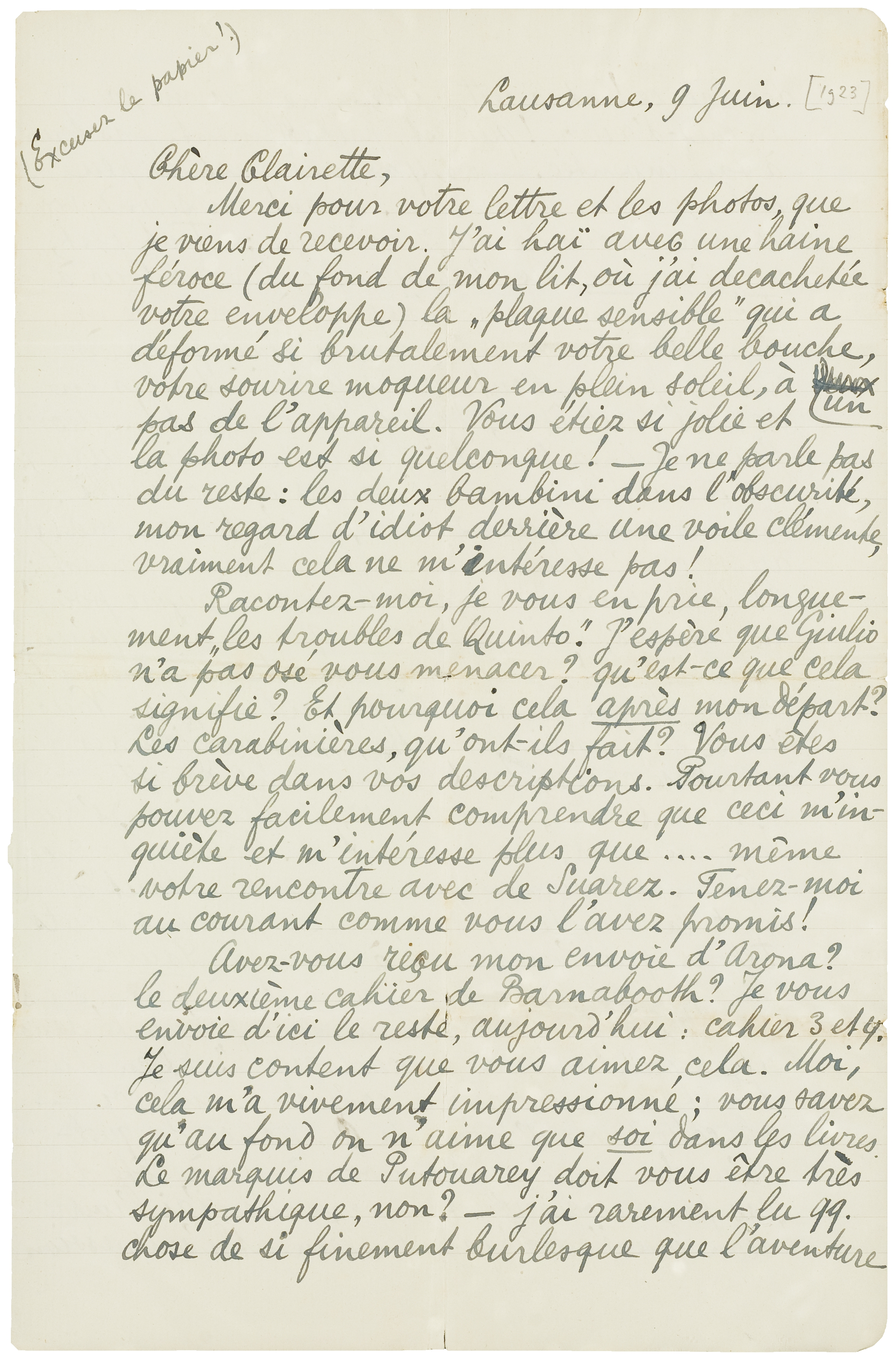 Merci pour votre lettre et les photos, que je viens de recevoir. J'ai haï avec une haine féroce (du fond de mon lit, où j'ai decachetée votre enveloppe) la ‘plaque sensible’ qui a déformé si brutalement votre belle bouche, votre sourire moqueur en plein soleil, à un pas de l'appareil. Vous étiez si jolie et la photo est si quelconque! - Je ne parle pas du reste: les deux bambini dans l'obscurité, mon regard d'idiot derrière une voile clémente, vraiment cela ne m'intéresse pas!