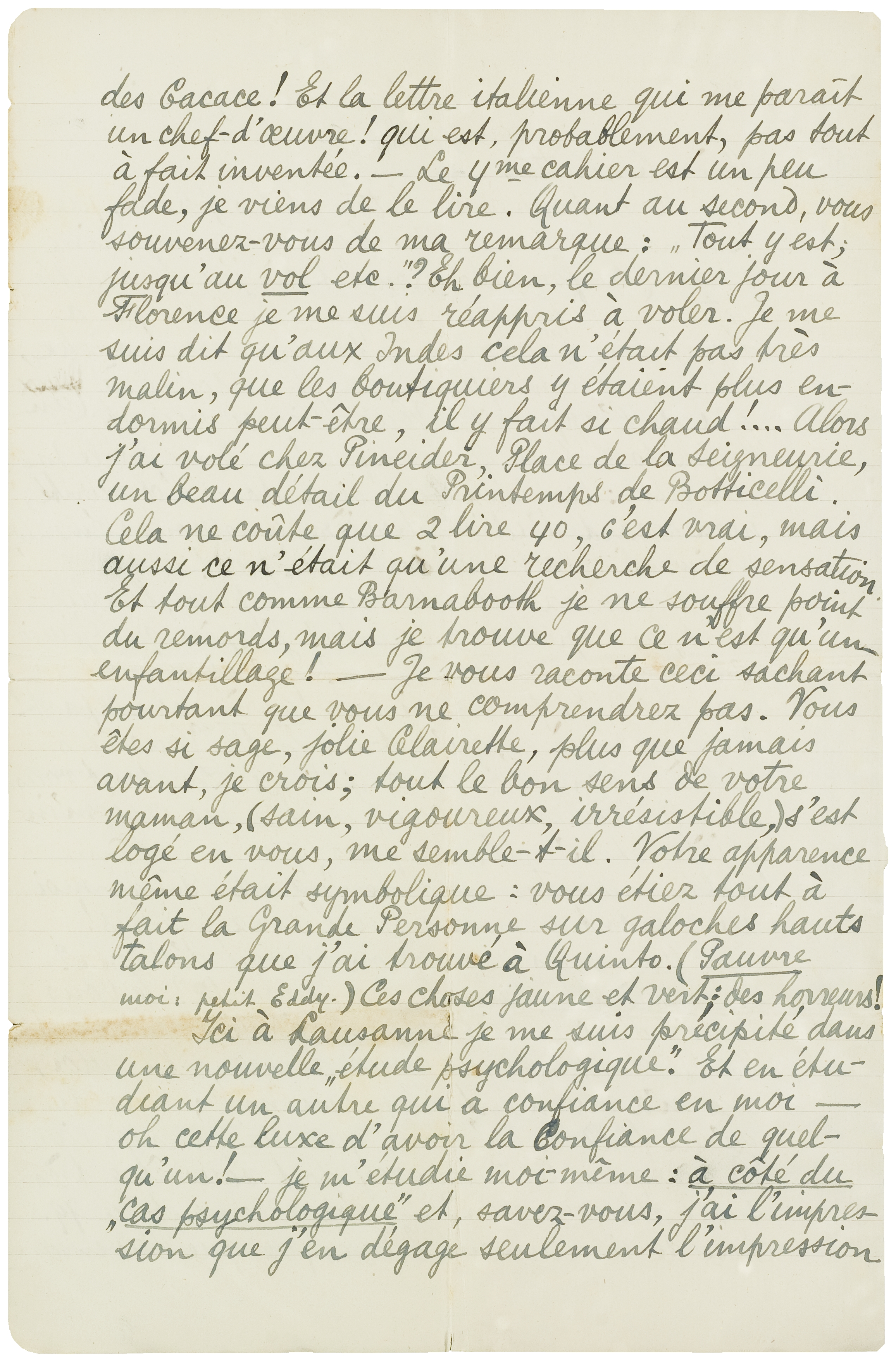 Avez-vous reçu mon envoie d'Arona? le deuxième cahier de Barnabooth? Je vous envoie d'ici le reste, aujourd'hui: cahier 3 et 4. Je suis content que vous aimez cela. Moi, cela m'a vivement impressionné; vous savez qu'au fond on n'aime que soi dans les livres. Le marquis de Putouarey doit vous être très sympathique, non? - j'ai rarement lu qq. chose de si finement burlesque que l'aventure des Cacace! Et la lettre italienne qui me paraît un chef-d'oeuvre! qui est, probablement, pas tout à fait inventée. - Le 4me cahier est un peu fade, je viens de le lire. Quant au second, vous souvenez-vous de ma remarque: ‘Tout y est; jusqu'au vol etc.’? Eh bien, le dernier jour à Florence je me suis réappris à voler. Je me suis dit qu'aux Indes cela n'était pas très malin, que les boutiquiers y étaient plus endormis peut-être, il y fait si chaud!... Alors j'ai volé chez Pineider, Place de la Seigneurie, un beau détail du Printemps de Botticelli. Cela ne coûte que 2 lire 40, c'est vrai, mais aussi ce n'était qu'une recherche de sensation. Et tout comme Barnabooth je ne souffre point du remords, mais je trouve que ce n'est qu'un enfantillage! - Je vous raconte ceci sachant pourtant que vous ne comprendrez pas. Vous êtes si sage, jolie Clairette, plus que jamais avant, je crois; tout le bon sens de votre maman, (sain, vigoureux, irrésistible,) s'est logé en vous, me semble-t-il. Votre apparence même était symbolique: vous étiez tout à fait la Grande Personne sur galoches hauts talons que j'ai trouvé à Quinto. (Pauvre moi: petit Eddy.) Ces choses jaune et vert; des horreurs.