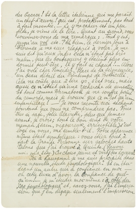 Ici à Lausanne je me suis précipité dans une nouvelle ‘étude psychologique’. Et en étudiant un autre qui a confiance en moi - oh cette luxe d'avoir la confiance de quelqu'un! - je m'étudie moi-même: à côté du ‘cas psychologique’ et, savez-vous, j'ai l'impression que j'en dégage seulement l'impression nette d'être ridicule et inutile. Impuissant plutôt:un impuissant qui parle beaucoup de mots inutiles. Peut-être avez vous raison: peut-être les petites convenances, gentillesses, délicatesses (je dirais presque: les sensibilités d'épiderme) sont-elles ce qu'il y a de plus important. Tous ces ‘coeurs mis à nu’, à quoi sert cela?