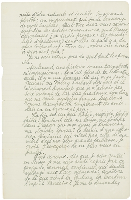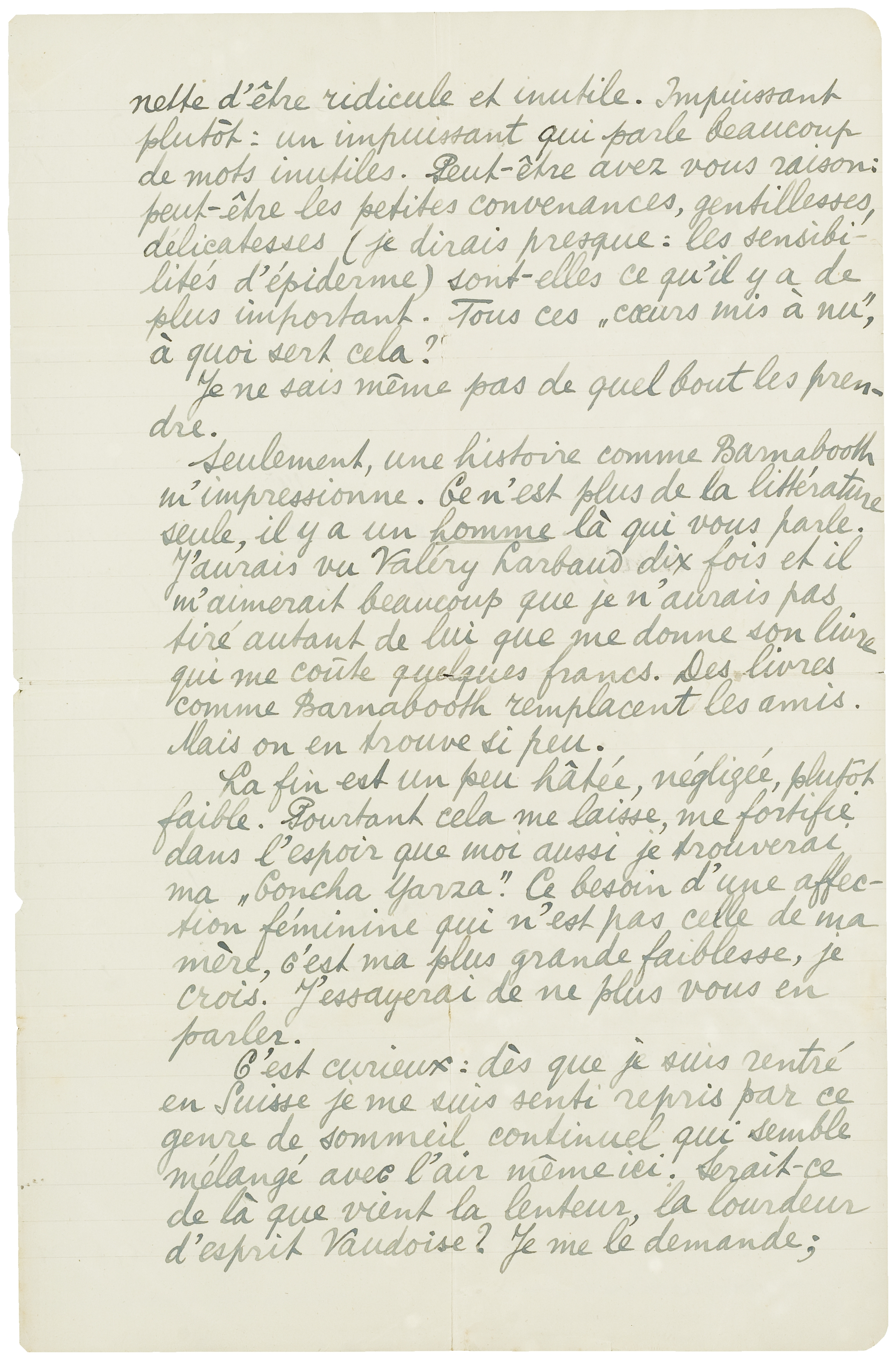Seulement, une histoire comme Barnabooth m'impressionne. Ce n'est plus de la littérature seule, il y a un homme là qui vous parle. J'aurais vu Valéry Larbaud dix fois et il m'aimerait beaucoup que je n'aurais pas tiré autant de lui que me donne son livre qui me coûte quelques francs. Des livres comme Barnabooth remplacent les amis. Mais on en trouve si peu.
