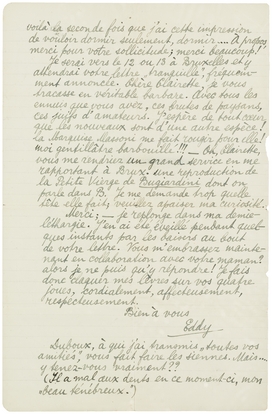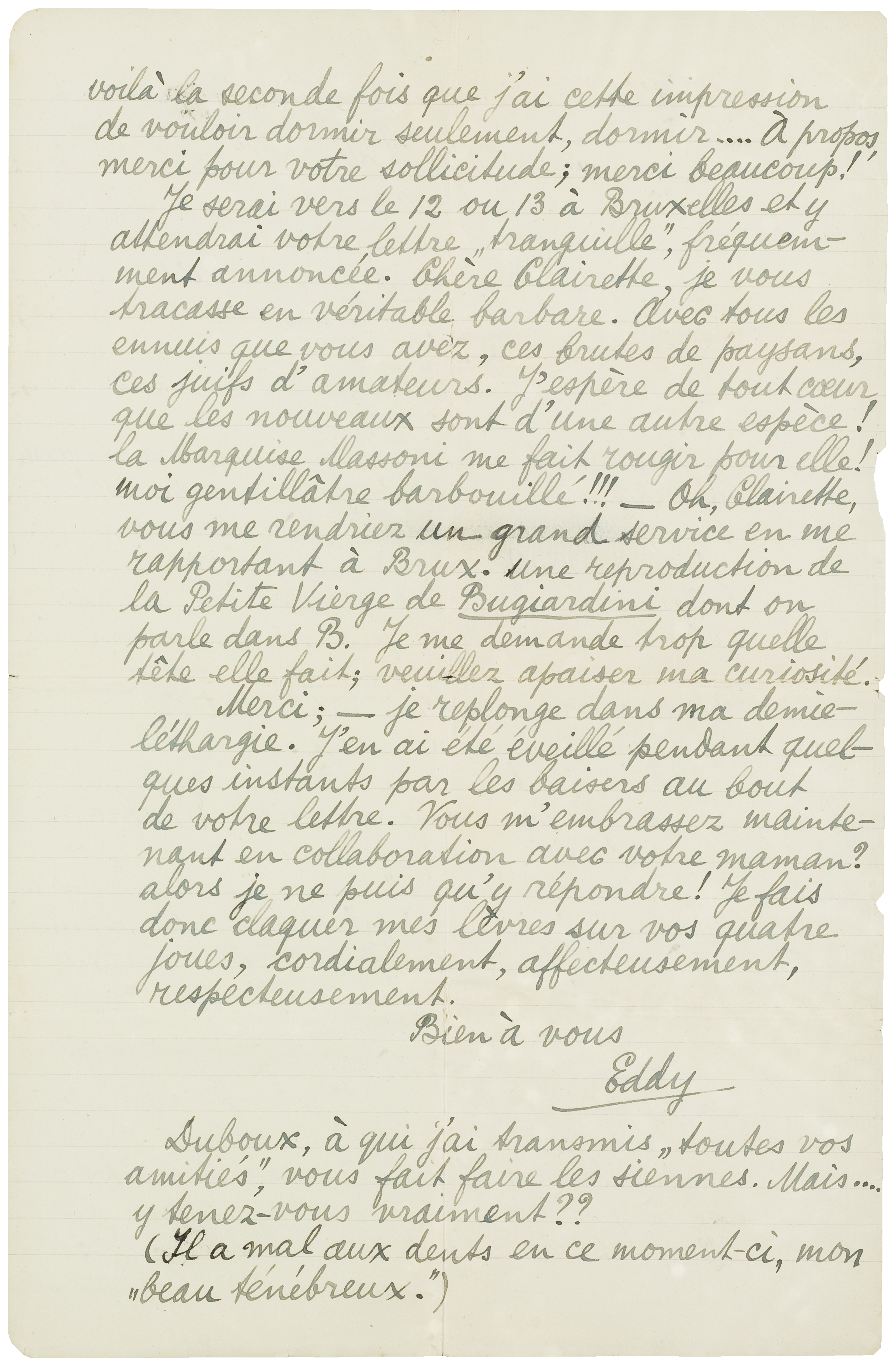 Je serai vers le 12 ou 13 à Bruxelles et y attendrai votre lettre ‘tranquille’, fréquemment annoncée. Chère Clairette, je vous tracasse en véritable barbare. Avec tous les ennuis que vous avez, ces brutes de paysans, ces juifs d'amateurs. J'espère de tout coeur que les nouveaux sont d'une autre espèce! la Marquise Massoni me fait rougir pour elle! moi gentillâtre barbouillé!!! - Oh, Clairette, vous me rendriez un grand service en me rapportant à Brux. une reproduction de la Petite Vierge de Bugiardini dont on parle dans B. Je me demande trop quelle tête elle fait; veuillez apaiser ma curiosité.