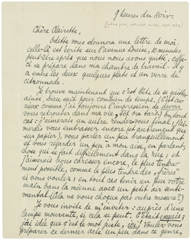 Je trouve maintenant que c'est bête de se quitter ainsi, Dieu sait pour combien de temps. (C'est curieux comme j'ai toujours l'impression de devoir vous retrouver dans ma vie, tôt ou tard.) En tout cas: j'aimerais un autre rendez-vous final; j'aimerais vous embrasser encore (et autrement que sur papier), vous parler un peu tranquillement et vous regarder un peu à mon aise, en parlant, chose qui se fait difficilement dans la rue; et j'aimerais vous caresser encore, le plus tendrement possible, comme le plus tendre des ‘frères’ si vous voulez; en tout cas tenir un peu votre main dans la mienne avec un petit air sentimental. (Cela ne vous choque pas outre mesure?)