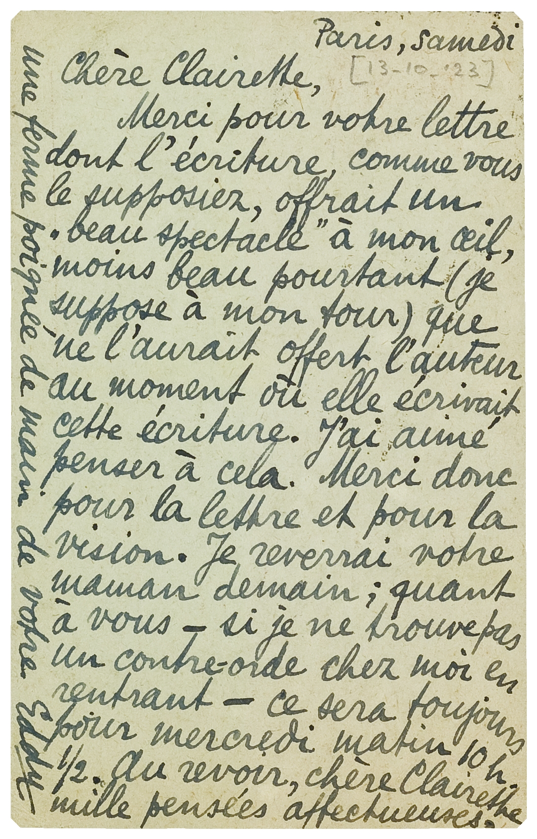 Merci pour votre lettre dont l'écriture comme vous le supposiez, offrait un ‘beau spectacle’ à mon oeil, moins beau pourtant (je suppose à mon tour) que ne l'aurait offert l'auteur au moment où elle écrivait cette écriture. J'ai aimé à penser cela. Merci donc pour la lettre et pour la vision. Je reverrai votre maman demain; quant à vous - si je ne trouve pas un contre-orde chez moi en rentrant - ce sera toujours pour mercredi matin 10h.½. Au revoir, chère Clairette, mille pensées affectueuses. Une ferme poignée de main de votre