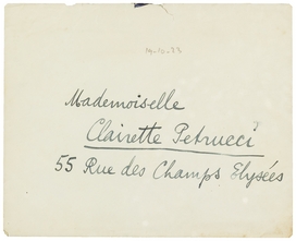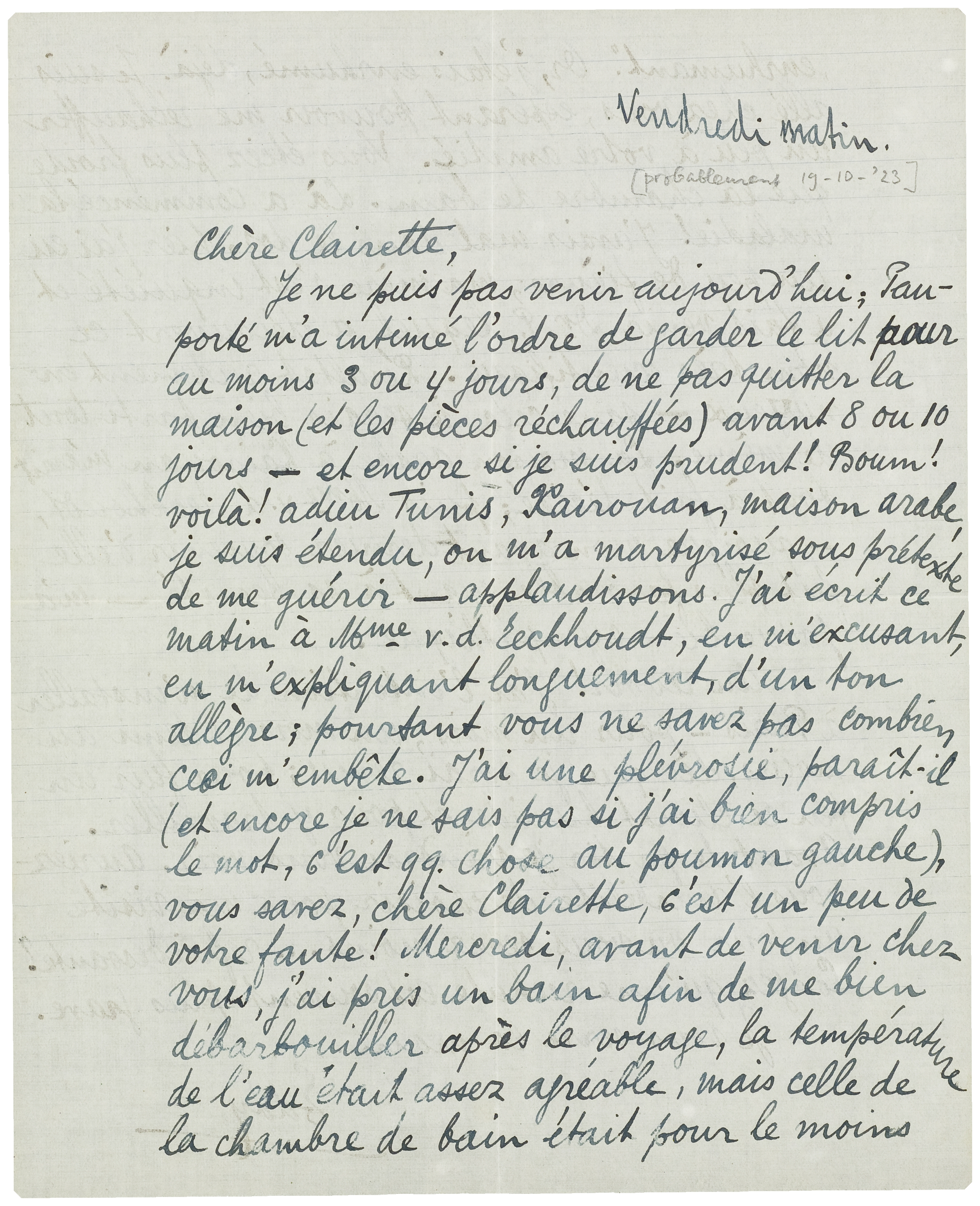 Je ne puis pas venir aujourd'hui; Pauporté m'a intimé l'ordre de garder le lit pour au moins 3 ou 4 jours, de ne pas quitter la maison (et les pièces réchauffées) avant 8 ou 10 jours - et encore si je suis prudent! Boum! voilà! adieu Tunis; Kairouan, maison arabe, je suis étendu, on m'a martyrisé sous prétexte de me guérir - applaudissons. J'ai écrit ce matin à Mme v.d. Eeckhoudt, en m'excusant, en m'expliquant longuement, d'un ton allègre; pourtant vous ne savez pas combien ceci m'embête. J'ai une plévrosie, paraît-il (et encore je ne sais pas si j'ai bien compris le mot, c'est qq. chose au poumon gauche), vous savez, chère Clairette, c'est un peu de votre faute! Mercredi, avant de venir chez vous, j'ai pris un bain afin de me bien débarbouiller après le voyage, la température de l'eau était assez agréable, mais celle de la chambre de bain était pour le moins ‘enrhumant’. Or, j'étais enrhumé, déjà. Je suis allé chez vous, espérant pouvoir me réchauffer un peu à votre amitié. Vous étiez plus froide que la chambre de bain. Là a commencé la maladie! J'avais mal dans le dos; hier j'ai eu un peu de fièvre; ma mère s'est inquiété et a fait venir Dr P., lequel a découvert ce nom très scientifique. Résultat rudement ennuyeux - sans cela je serais bien parti tout de même. La maison arabe à Kairouan m'avait tout à fait décidé; puis Mme v.d. Eeckhoudt, - quoique mon avant-dernier souvenir d'elle fut plus favorable quant à sa beauté - m'a parue bien sympathique.